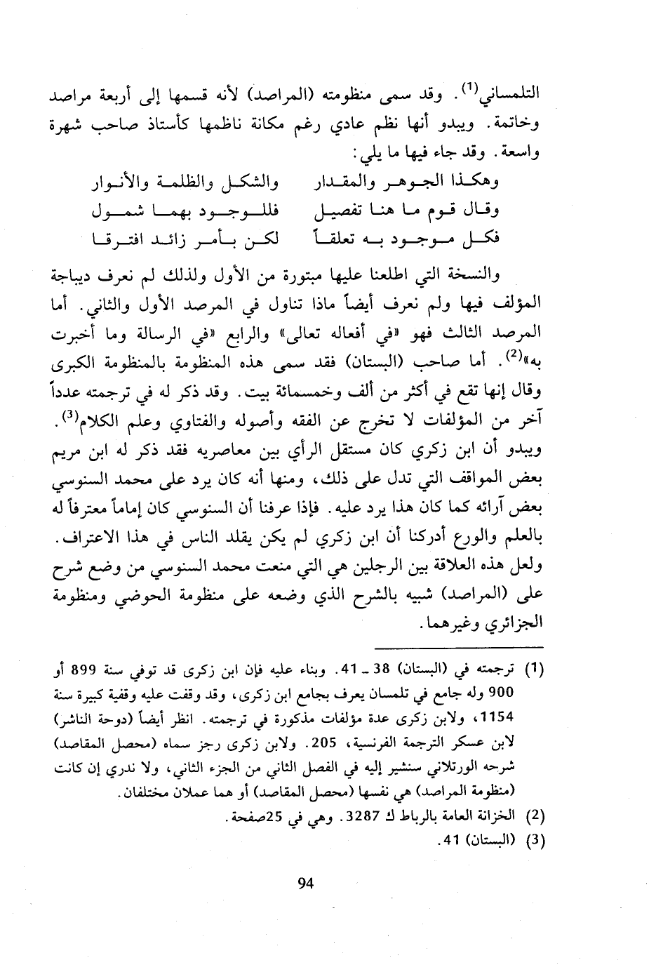 (¬1) ترجمته في (البستان) 38 - 41. وبناء عليه فإن ابن زكرى قد توفي سنة 899 أو 900 وله جامع في تلمسان يعرف بجامع ابن زكرى، وقد وقفت عليه وقفية كبيرة سنة 1154، ولابن زكرى عدة مؤلفات مذكورة في ترجمته. انظر أيضا (دوحة الناشر) لابن عسكر الترجمة الفرنسية، 205. ولابن زكرى رجز سماه (محصل المقاصد) شرجه الورتلاني سنشير إليه في الفصل الثاني من الجزء الثاني، ولا ندري إن كانت (منظومة المراصد) هي نفسها (محصل المقاصد) أو هما عملان مختلفان.