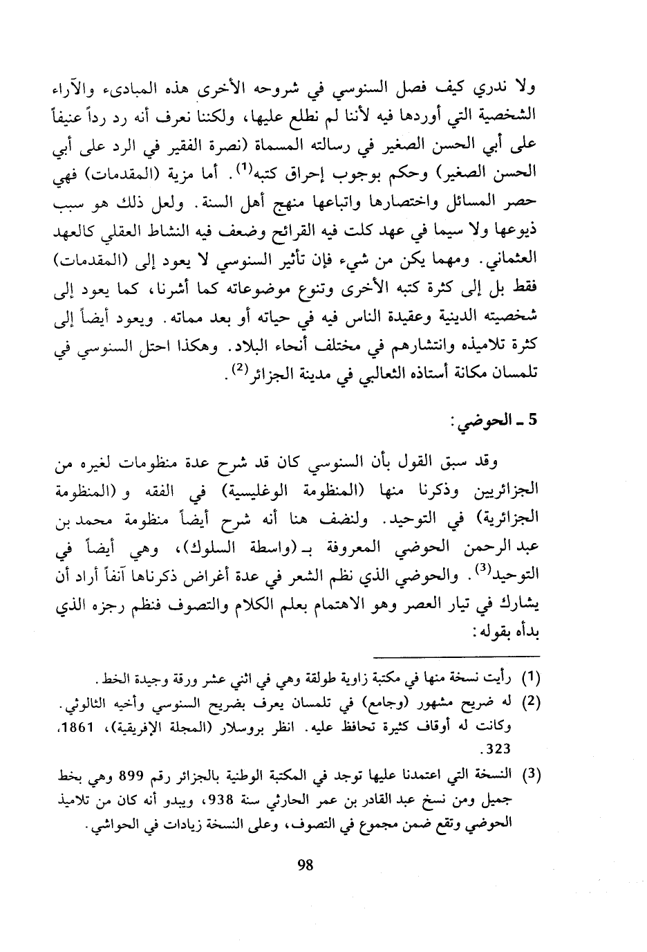 (¬3) النسخة التي اعتمدنا عليها توجد في المكتبة الوطنية بالجزائر رقم 899 وهي بخط جميل ومن نسخ عبد القادر بن عمر الحارثي سنة 938، ويبدو أنه كان من تلاميذ الحوضي وتقع ضمن مجموع في التصوف، وعلى النسخة زيادات في الحواشي.