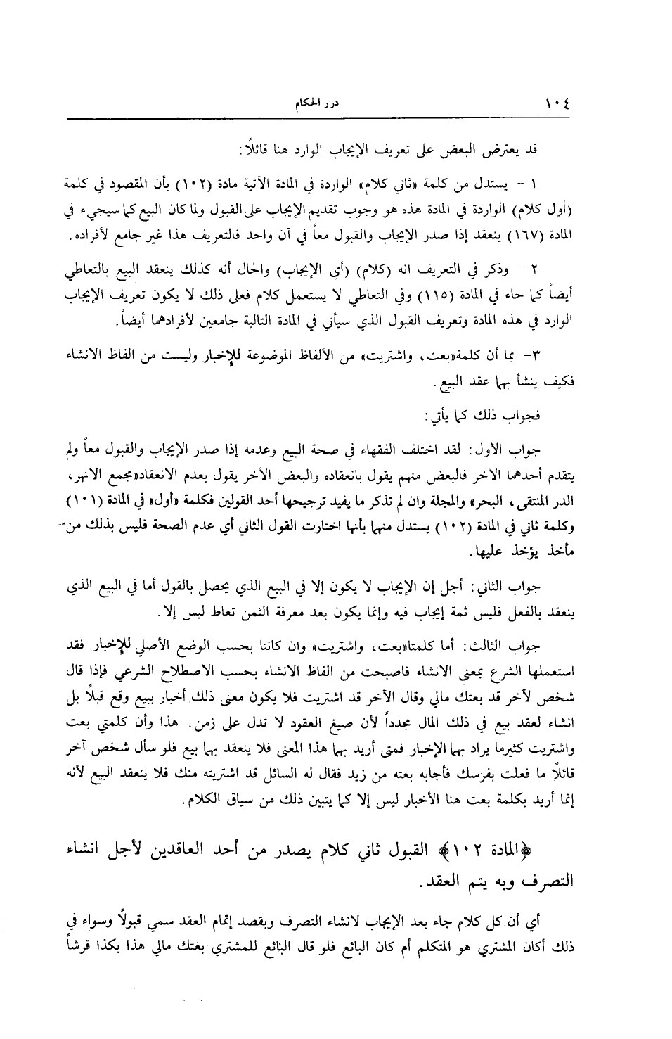 فَجَوَابُ ذَلِكَ كَمَا يَأْتِي: جَوَابُ الْأَوَّلِ: لَقَدْ اخْتَلَفَ الْفُقَهَاءُ فِي صِحَّةِ الْبَيْعِ وَعَدَمِهِ إذَا صَدَرَ الْإِيجَابُ وَالْقَبُولُ مَعًا وَلَمْ يَتَقَدَّمْ أَحَدُهُمَا الْآخَرَ فَالْبَعْضُ مِنْهُمْ يَقُولُ بِانْعِقَادِهِ وَالْبَعْضُ الْآخَرُ يَقُولُ بِعَدَمِ الِانْعِقَادِ (مَجْمَعُ الْأَنْهُرِ، الدُّرُّ الْمُنْتَقَى، الْبَحْرُ) وَالْمَجَلَّةُ وَإِنْ لَمْ تَذْكُرْ مَا يُفِيدُ تَرْجِيحَهَا أَحَدَ الْقَوْلَيْنِ فَكَلِمَةُ (أَوَّلُ) فِي الْمَادَّةِ (101) وَكَلِمَةُ ثَانِي فِي الْمَادَّةِ (102) يُسْتَدَلُّ مِنْهُمَا بِأَنَّهَا اخْتَارَتْ الْقَوْلَ الثَّانِيَ أَيْ عَدَمَ الصِّحَّةِ فَلَيْسَ بِذَلِكَ مِنْ مَأْخَذٍ يُؤْخَذُ عَلَيْهَا.