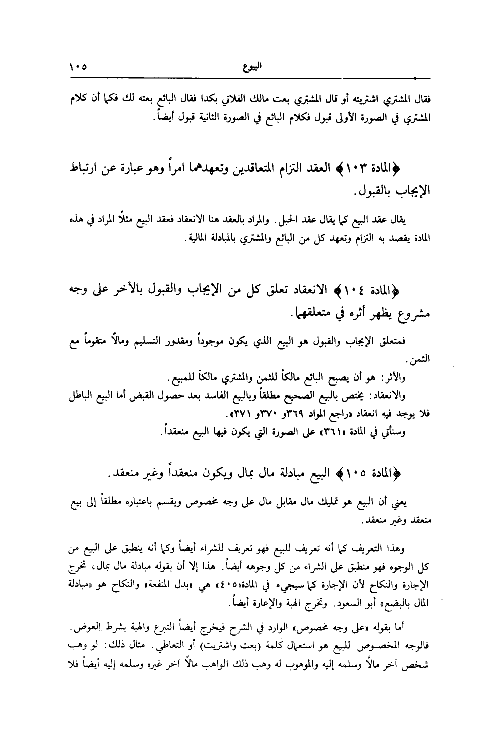 (الْمَادَّةُ 105) الْبَيْعُ: مُبَادَلَةُ مَالٍ بِمَالِ وَيَكُونُ مُنْعَقِدًا وَغَيْرَ مُنْعَقِدٍ.