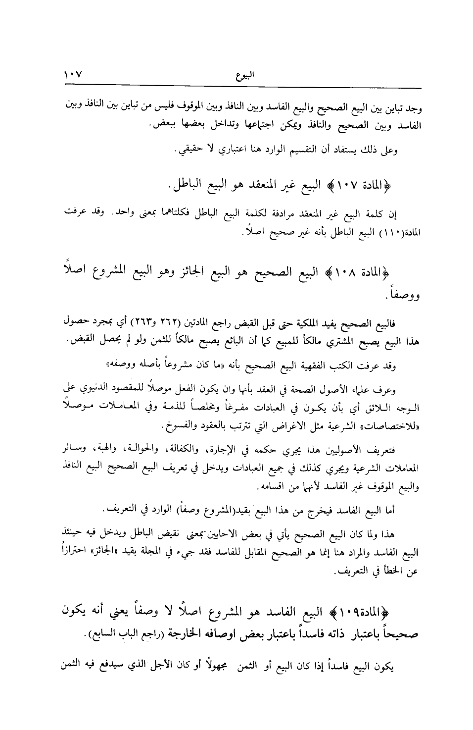 (الْمَادَّةُ 108) الْبَيْعُ الصَّحِيحُ هُوَ الْبَيْعُ الْجَائِزُ وَهُوَ الْبَيْعُ الْمَشْرُوعُ أَصْلًا وَوَصْفًا.