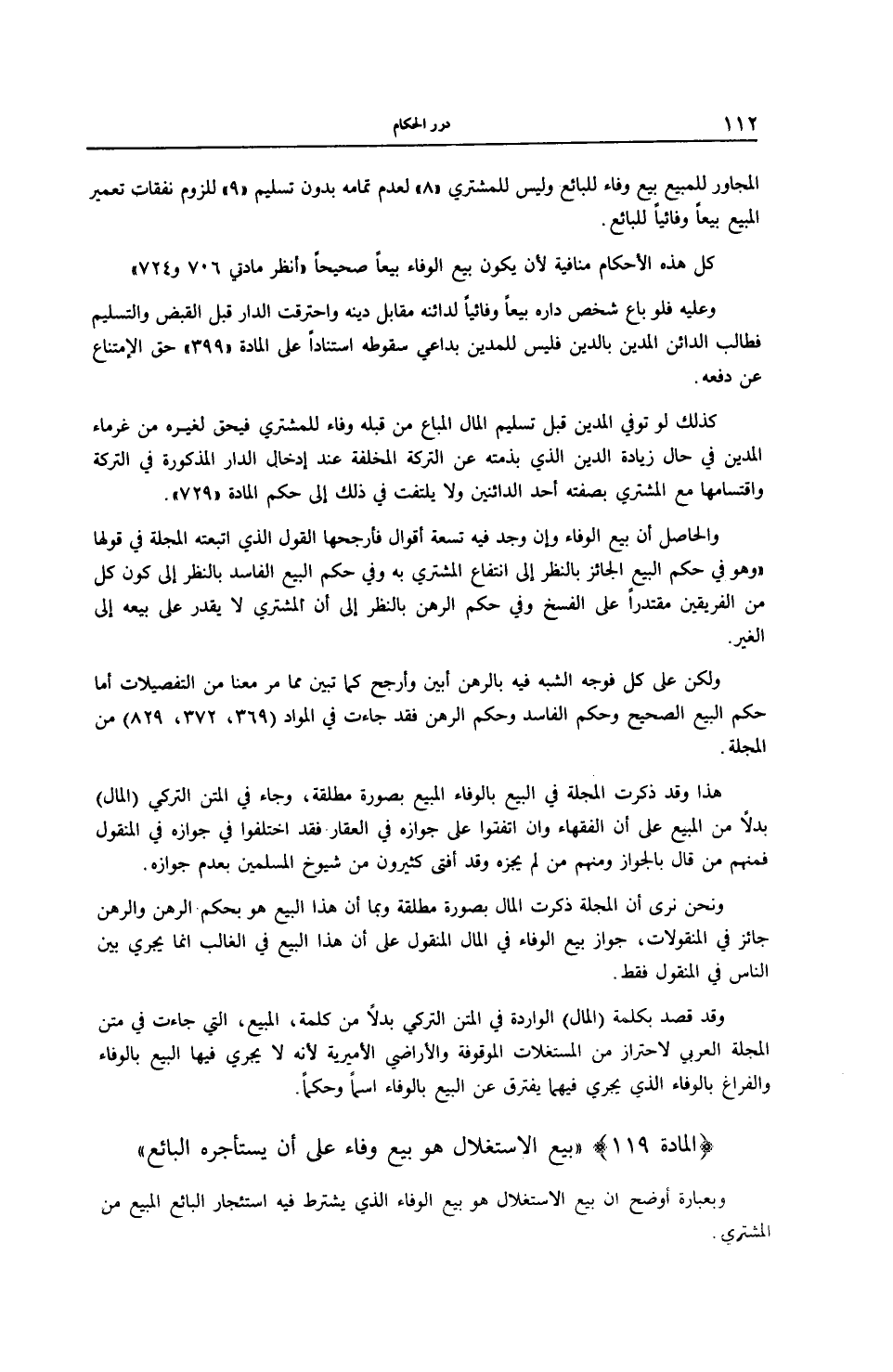 (الْمَادَّةُ 119) (بَيْعُ الِاسْتِغْلَالِ هُوَ بَيْعُ وَفَاءٍ عَلَى أَنْ يَسْتَأْجِرَهُ الْبَائِعُ) وَبِعِبَارَةٍ أَوْضَحَ إنَّ بَيْعَ الِاسْتِغْلَالِ هُوَ بَيْعُ الْوَفَاءِ الَّذِي يُشْتَرَطُ فِيهِ اسْتِئْجَارُ الْبَائِعِ الْمَبِيعَ مِنْ الْمُشْتَرِي.