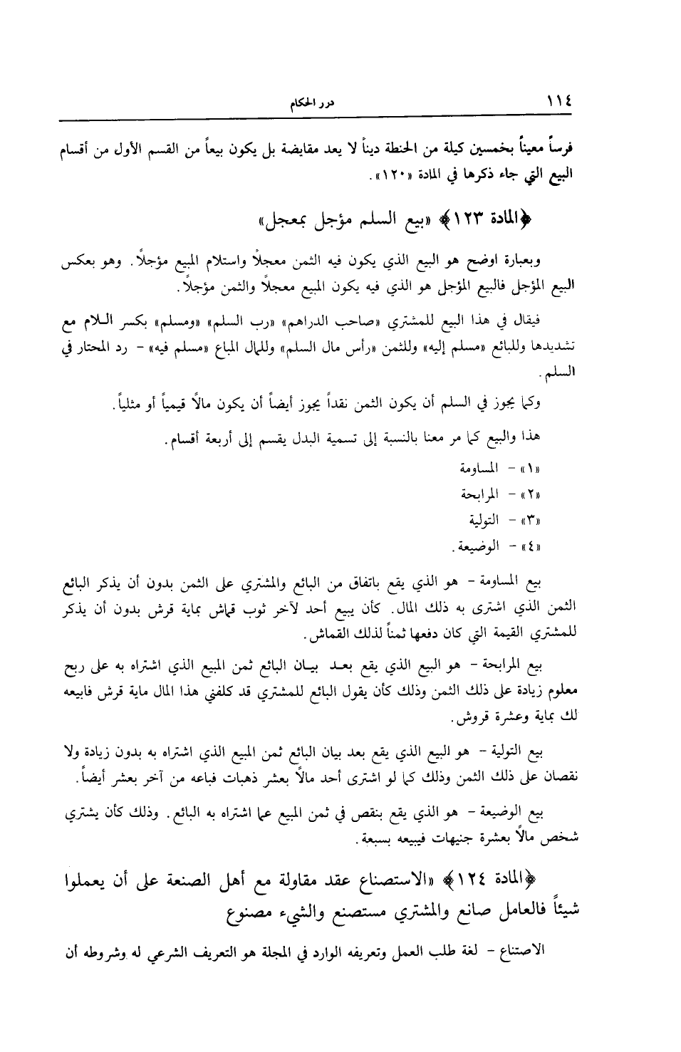 (الْمَادَّةُ 123) (بَيْعُ السَّلَمِ مُؤَجَّلٌ بِمُعَجَّلٍ) وَبِعِبَارَةٍ أَوْضَحَ هُوَ الْبَيْعُ الَّذِي يَكُونُ فِيهِ الثَّمَنُ مُعَجَّلًا وَاسْتِلَامُ الْمَبِيعِ مُؤَجَّلًا. وَهُوَ بِعَكْسِ الْبَيْعِ الْمُؤَجَّلِ فَالْبَيْعُ الْمُؤَجَّلُ هُوَ الَّذِي فِيهِ يَكُونُ الْمَبِيعُ مُعَجَّلًا وَالثَّمَنُ مُؤَجَّلًا.