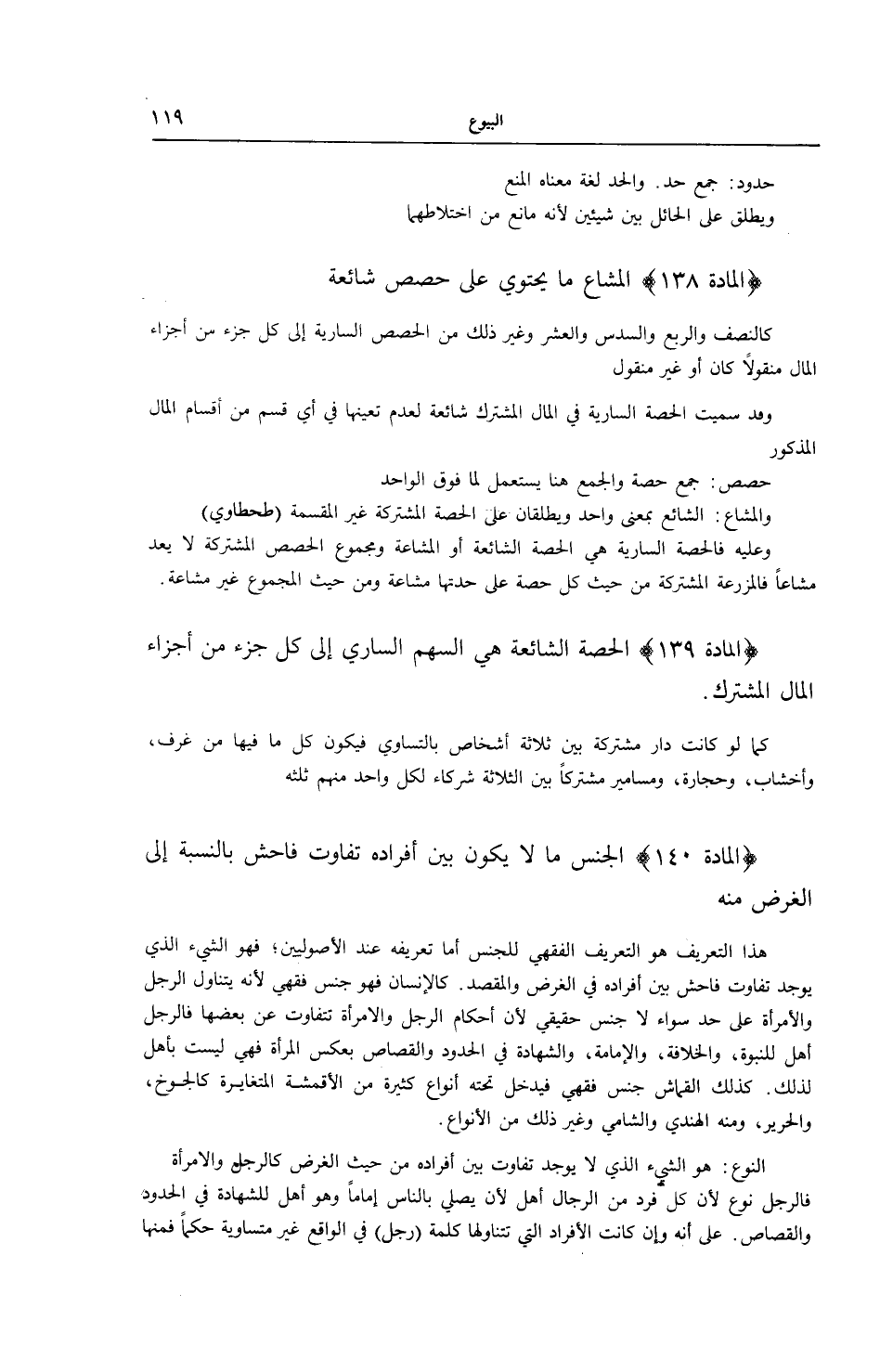 [ (الْمَادَّةُ 138) الْمُشَاعُ مَا يَحْتَوِي عَلَى حِصَصٍ شَائِعَةٍ]