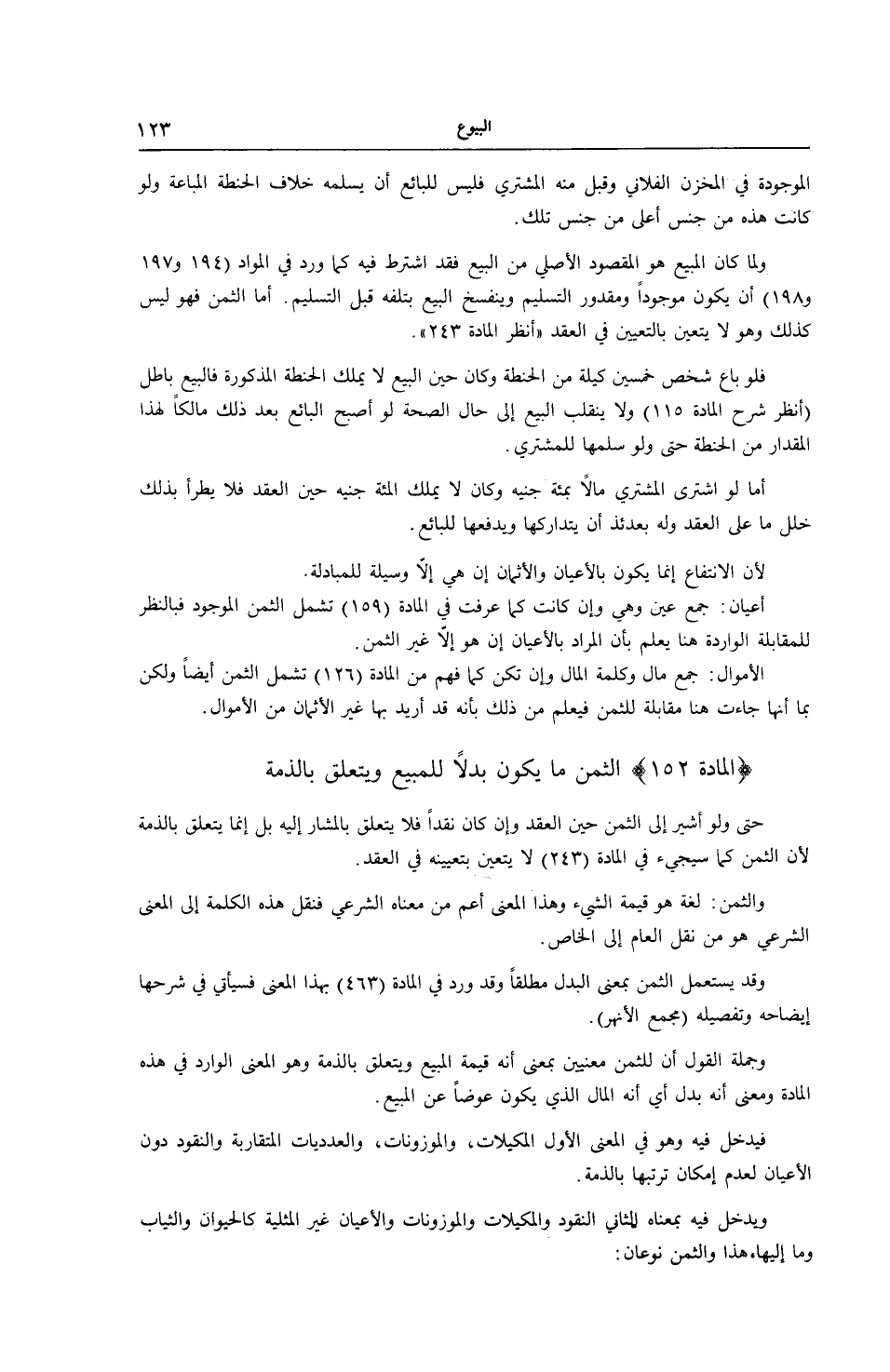 وَجُمْلَةُ الْقَوْلِ أَنَّ لِلثَّمَنِ مَعْنَيَيْنِ بِمَعْنَى أَنَّهُ قِيمَةُ الْمَبِيعِ وَيَتَعَلَّقُ بِالذِّمَّةِ وَهُوَ الْمَعْنَى الْوَارِدُ فِي هَذِهِ الْمَادَّةِ، وَمَعْنَى أَنَّهُ بَدَلٌ: أَيْ أَنَّهُ الْمَالُ الَّذِي يَكُونُ عِوَضًا عَنْ الْمَبِيعِ.