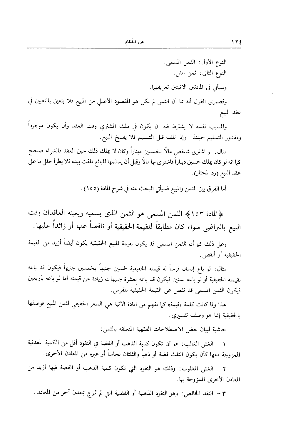 (الْمَادَّةُ 153) الثَّمَنُ الْمُسَمَّى هُوَ الثَّمَنُ الَّذِي يُسَمِّيهِ وَيُعَيِّنُهُ الْعَاقِدَانِ وَقْتَ الْبَيْعِ بِالتَّرَاضِي سَوَاءٌ كَانَ مُطَابِقًا لِلْقِيمَةِ الْحَقِيقِيَّةِ أَوْ نَاقِصًا عَنْهَا أَوْ زَائِدًا عَلَيْهَا.
