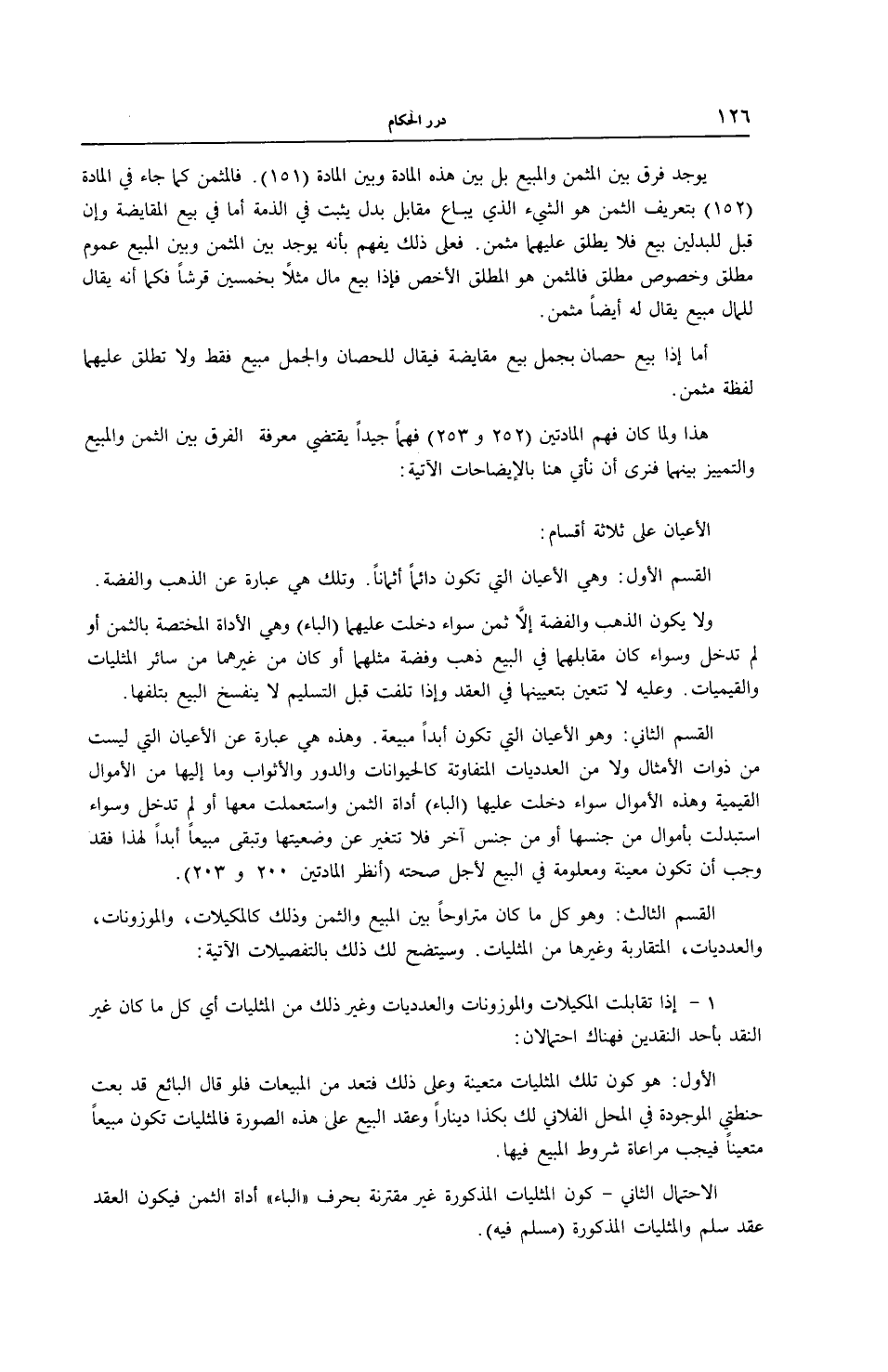 وَهُوَ الْأَعْيَانُ الَّتِي تَكُونُ أَبَدًا مَبِيعَةً. وَهَذِهِ هِيَ عِبَارَةٌ عَنْ الْأَعْيَانِ الَّتِي لَيْسَتْ مِنْ ذَوَاتِ الْأَمْثَالِ وَلَا مِنْ الْعَدَدِيَّاتِ الْمُتَفَاوِتَةِ كَالْحَيَوَانَاتِ وَالدُّورِ وَالْأَثْوَابِ وَمَا إلَيْهَا مِنْ الْأَمْوَالِ الْقِيَمِيَّةِ، وَهَذِهِ الْأَمْوَالُ سَوَاءٌ دَخَلَتْ عَلَيْهَا (الْبَاءُ) أَدَاةُ الثَّمَنِ وَاسْتُعْمِلَتْ مَعَهَا أَوْ لَمْ تَدْخُلْ وَسَوَاءٌ اُسْتُبْدِلَتْ بِأَمْوَالٍ مِنْ جِنْسِهَا أَوْ مِنْ جِنْسٍ آخَرَ فَلَا تَتَغَيَّرُ عَنْ وَضْعِيَّتِهَا وَتَبْقَى مَبِيعًا أَبَدًا لِهَذَا فَقَدْ وَجَبَ أَنْ تَكُونَ مُعَيَّنَةً وَمَعْلُومَةً فِي الْبَيْعِ لِأَجْلِ صِحَّتِهِ (اُنْظُرْ الْمَادَّتَيْنِ 200 و 203) .