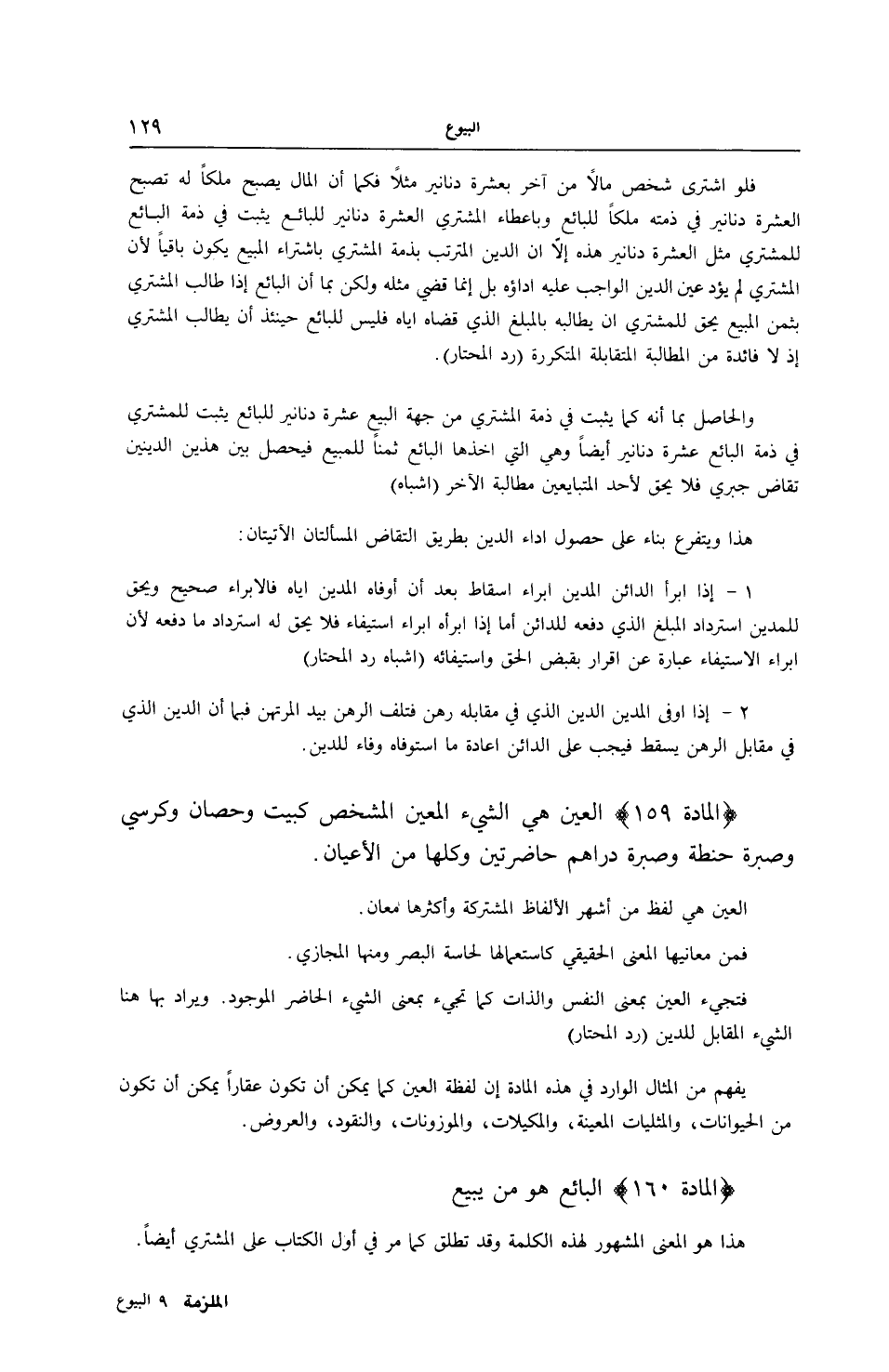 (الْمَادَّةُ 159) الْعَيْنُ: هِيَ الشَّيْءُ الْمُعَيَّنُ الْمُشَخَّصُ كَبَيْتٍ وَحِصَانٍ وَكُرْسِيٍّ وَصُبْرَةِ حِنْطَةٍ وَصُبْرَةِ دَرَاهِمَ حَاضِرَتَيْنِ وَكُلُّهَا مِنْ الْأَعْيَانِ. الْعَيْنُ: هِيَ لَفْظٌ مِنْ أَشْهَرِ الْأَلْفَاظِ الْمُشْتَرَكَةِ وَأَكْثَرِهَا مَعَانٍ. فَمِنْ مَعَانِيهَا الْمَعْنَى الْحَقِيقِيُّ كَاسْتِعْمَالِهَا لِحَاسَّةِ الْبَصَرِ وَمِنْهَا الْمَجَازِيُّ. فَتَجِيءُ الْعَيْنُ بِمَعْنَى النَّفْسِ وَالذَّاتِ كَمَا تَجِيءُ بِمَعْنَى الشَّيْءِ الْحَاضِرِ الْمَوْجُودِ وَيُرَادُ بِهَا هُنَا الشَّيْءُ الْمُقَابِلُ لِلدَّيْنِ (رَدُّ الْمُحْتَارِ) .