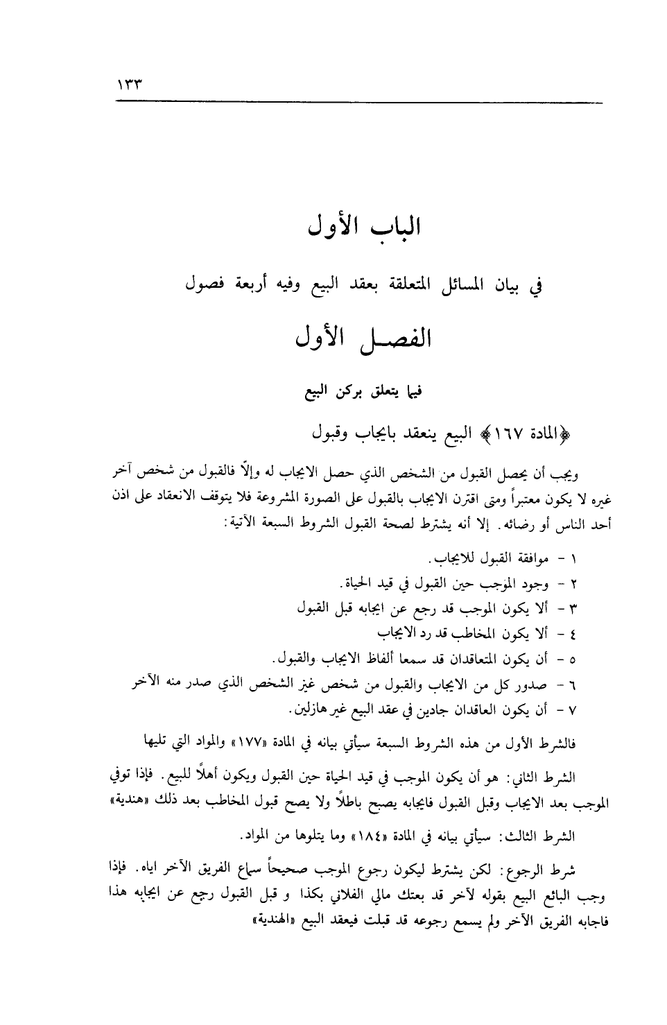 فَالشَّرْطُ الْأَوَّلُ مِنْ هَذِهِ الشُّرُوطِ السَّبْعَةِ سَيَأْتِي بَيَانُهُ فِي الْمَادَّةِ " 177 " وَالْمَوَادِّ الَّتِي تَلِيهَا.