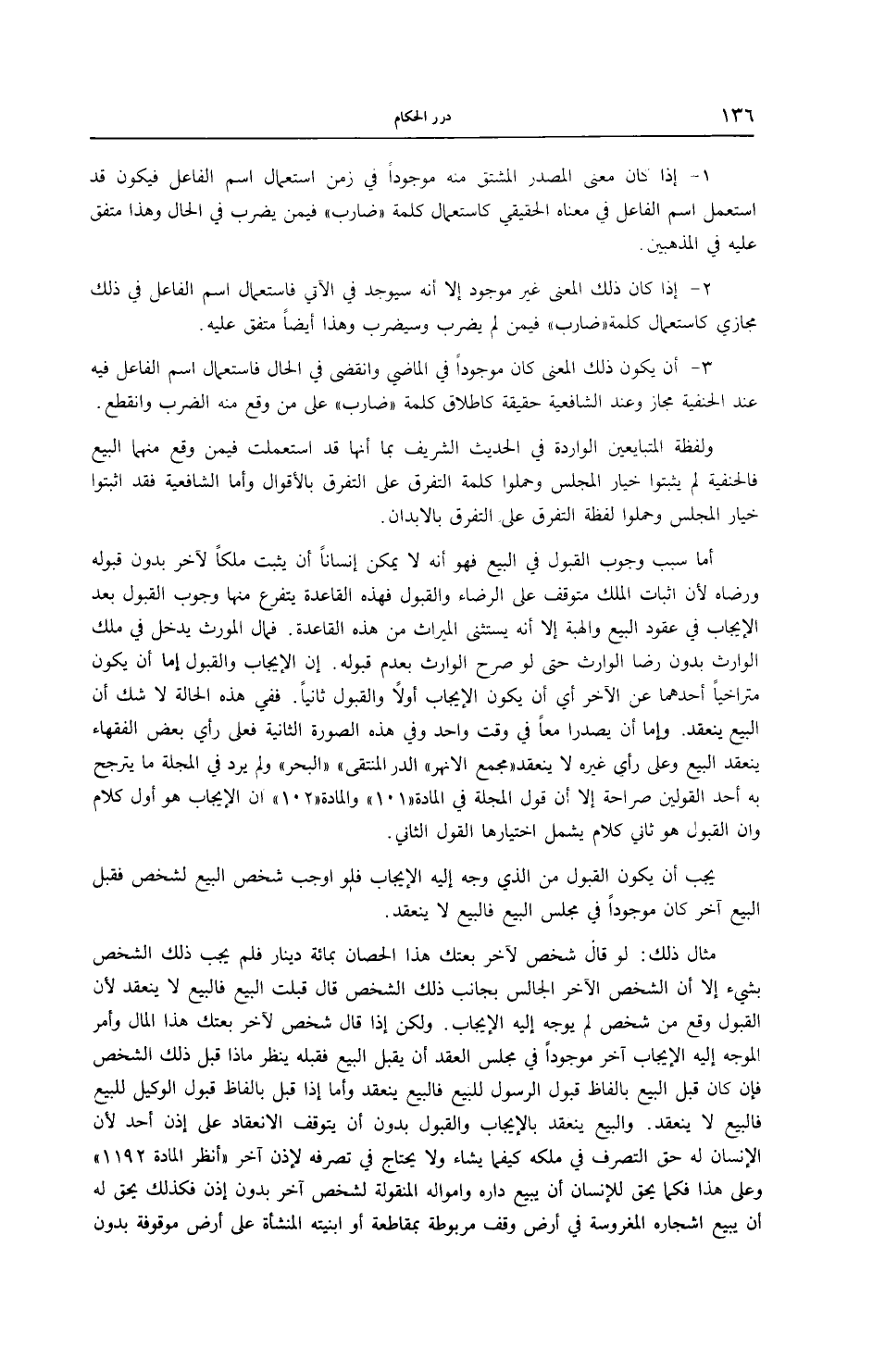 أَمَّا سَبَبُ وُجُوبِ الْقَبُولِ فِي الْبَيْعِ فَهُوَ أَنَّهُ لَا يُمْكِنُ لِإِنْسَانٍ أَنْ يُثْبِتَ مِلْكًا لِآخَرَ بِدُونِ قَبُولِهِ وَرِضَاهُ؛ لِأَنَّ إثْبَاتَ الْمِلْكِ مُتَوَقِّفٌ عَلَى الرِّضَاءِ وَالْقَبُولِ فَهَذِهِ الْقَاعِدَةُ يَتَفَرَّعُ مِنْهَا وُجُوبُ الْقَبُولِ بَعْدَ الْإِيجَابِ فِي عُقُودِ الْبَيْعِ وَالْهِبَةِ إلَّا أَنَّهُ يُسْتَثْنَى الْمِيرَاثُ مِنْ هَذِهِ الْقَاعِدَةِ. فَمَالُ الْمُوَرِّثِ يَدْخُلُ فِي مِلْكِ الْوَارِثِ بِدُونِ رِضَا الْوَارِثِ - حَتَّى لَوْ صَرَّحَ الْوَارِثُ بِعَدَمِ قَبُولِهِ. إنَّ الْإِيجَابَ وَالْقَبُولَ إمَّا أَنْ يَكُونَ مُتَرَاخِيًا أَحَدُهُمَا عَنْ الْآخَرِ أَيْ أَنْ يَكُونَ الْإِيجَابُ أَوَّلًا وَالْقَبُولُ ثَانِيًا. فَفِي هَذِهِ الْحَالَةِ لَا شَكَّ أَنَّ الْبَيْعَ يَنْعَقِدُ. وَإِمَّا أَنْ يَصْدُرَا مَعًا فِي وَقْتٍ وَاحِدٍ وَفِي هَذِهِ الصُّورَةِ الثَّانِيَةِ فَعَلَى رَأْيِ بَعْضِ الْفُقَهَاءِ يَنْعَقِدُ الْبَيْعُ وَعَلَى رَأْيِ غَيْرِهِ لَا يَنْعَقِدُ مَجْمَعُ الْأَنْهُرِ " الدُّرُّ الْمُنْتَقَى " الْبَحْرُ، وَلَمْ يَرِدْ فِي الْمَجَلَّةِ مَا يَتَرَجَّحُ بِهِ أَحَدُ الْقَوْلَيْنِ صَرَاحَةً إلَّا أَنَّ قَوْلَ الْمَجَلَّةِ فِي الْمَادَّةِ " 101 " وَالْمَادَّةِ " 102 " إنَّ الْإِيجَابَ هُوَ أَوَّلُ كَلَامٍ وَأَنَّ الْقَبُولَ هُوَ ثَانِي كَلَامٍ يَشْمَلُ اخْتِيَارُهَا الْقَوْلَ الثَّانِيَ.