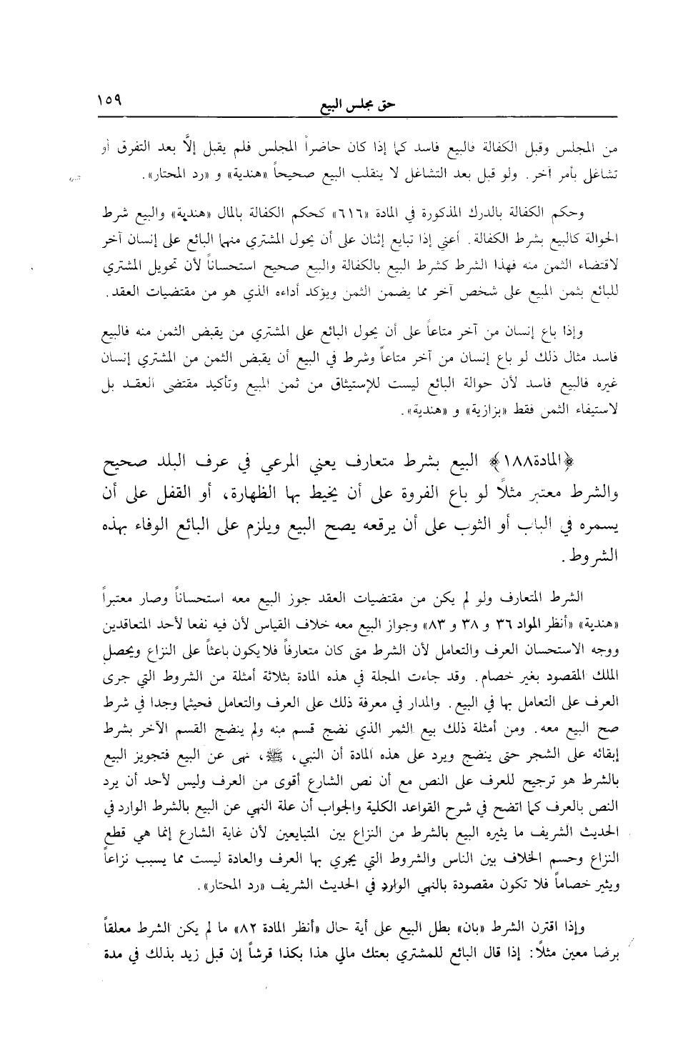 الشَّرْطُ الْمُتَعَارَفُ وَلَوْ لَمْ يَكُنْ مِنْ مُقْتَضَيَاتِ الْعَقْدِ جُوِّزَ الْبَيْعُ مَعَهُ اسْتِحْسَانًا وَصَارَ مُعْتَبَرًا هِنْدِيَّةٌ " " اُنْظُرْ الْمَوَادَّ 36 و 38 و 83 " وَجَوَازُ الْبَيْعِ مَعَهُ خِلَافُ الْقِيَاسِ؛ لِأَنَّ فِيهِ نَفْعًا لِأَحَدِ الْمُتَعَاقِدَيْنِ وَوَجْهُ الِاسْتِحْسَانِ الْعُرْفُ وَالتَّعَامُلُ؛ لِأَنَّ الشَّرْطَ مَتَى كَانَ مُتَعَارَفًا فَلَا يَكُونُ بَاعِثًا عَلَى النِّزَاعِ وَيَحْصُلُ الْمِلْكُ الْمَقْصُودُ بِغَيْرِ خِصَامٍ. وَقَدْ جَاءَتْ الْمَجَلَّةُ فِي هَذِهِ الْمَادَّةِ بِثَلَاثَةِ أَمْثِلَةٍ مِنْ الشُّرُوطِ الَّتِي جَرَى الْعُرْفُ عَلَى التَّعَامُلِ بِهَا فِي الْبَيْعِ. وَالْمَدَارُ فِي مَعْرِفَةِ ذَلِكَ عَلَى الْعُرْفِ وَالتَّعَامُلِ فَحَيْثُمَا وُجِدَا فِي شَرْطٍ صَحَّ الْبَيْعُ مَعَهُ. وَمِنْ أَمْثِلَةِ ذَلِكَ بَيْعُ الثَّمَرِ الَّذِي نَضِجَ قِسْمٌ مِنْهُ وَلَمْ يَنْضَجْ الْقِسْمُ الْآخَرُ بِشَرْطِ إبْقَائِهِ عَلَى الشَّجَرِ حَتَّى يَنْضَجَ وَيَرِدُ عَلَى هَذِهِ الْمَادَّةِ أَنَّ النَّبِيَّ - صَلَّى اللَّهُ عَلَيْهِ وَسَلَّمَ - نَهَى عَنْ الْبَيْعِ فَتَجْوِيزُ الْبَيْعِ بِالشَّرْطِ هُوَ تَرْجِيحٌ لِلْعُرْفِ عَلَى النَّصِّ مَعَ أَنَّ نَصَّ الشَّارِعِ أَقْوَى مِنْ الْعُرْفِ وَلَيْسَ لِأَحَدٍ أَنْ يَرُدَّ النَّصَّ بِالْعُرْفِ كَمَا اتَّضَحَ فِي شَرْحِ الْقَوَاعِدِ الْكُلِّيَّةِ وَالْجَوَابُ أَنَّ عِلَّةَ النَّهْيِ عَنْ الْبَيْعِ بِالشَّرْطِ الْوَارِدِ فِي الْحَدِيثِ الشَّرِيفِ مَا يُثِيرُهُ الْبَيْعُ بِالشَّرْطِ مِنْ النِّزَاعِ بَيْنَ الْمُتَبَايِعَيْنِ؛ لِأَنَّ غَايَةَ الشَّارِعِ إنَّمَا هِيَ قَطْعُ النِّزَاعِ وَحَسْمُ الْخِلَافِ بَيْنَ النَّاسِ وَالشُّرُوطُ الَّتِي يَجْرِي بِهَا الْعُرْفُ وَالْعَادَةُ لَيْسَتْ مِمَّا يُسَبِّبُ نِزَاعًا وَيُثِيرُ خِصَامًا فَلَا تَكُونُ مَقْصُودَةً بِالنَّهْيِ الْوَارِدِ فِي الْحَدِيثِ الشَّرِيفِ رَدُّ الْمُحْتَارِ ".
