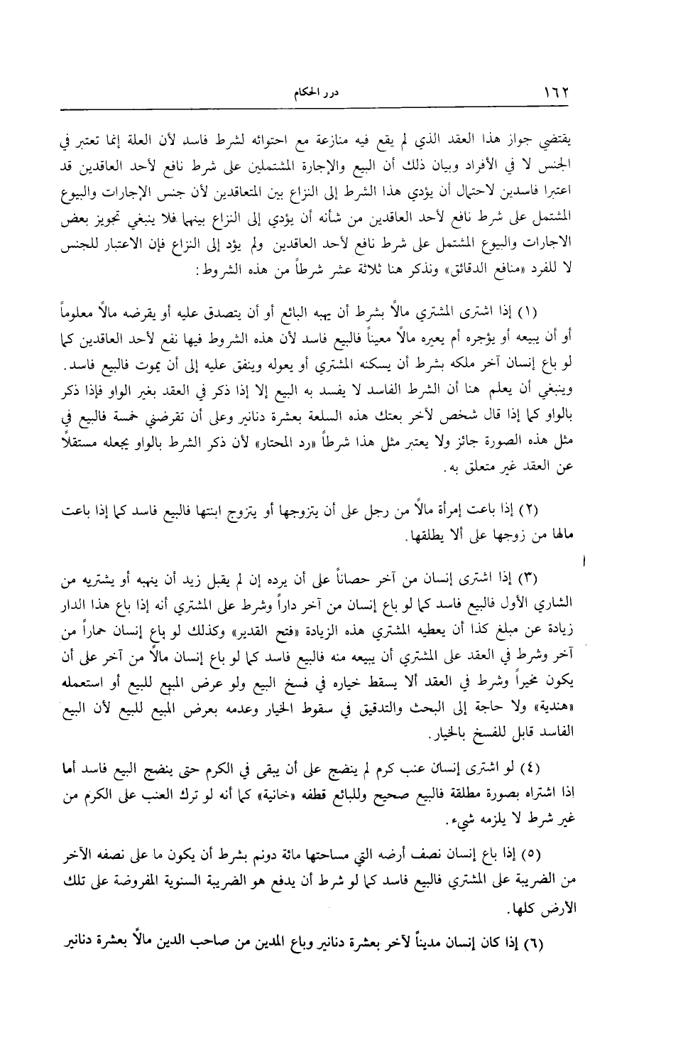 (5) إذَا بَاعَ إنْسَانٌ نِصْفَ أَرْضِهِ الَّتِي مِسَاحَتُهَا مِائَةٌ دُونَم بِشَرْطِ أَنْ يَكُونَ مَا عَلَى نِصْفِهِ الْآخَرِ مِنْ الضَّرِيبَةِ عَلَى الْمُشْتَرِي فَالْبَيْعُ فَاسِدٌ كَمَا لَوْ شَرَطَ أَنْ يَدْفَعَ هُوَ الضَّرِيبَةَ السَّنَوِيَّةَ الْمَفْرُوضَةَ عَلَى تِلْكَ الْأَرْضِ كُلَّهَا.