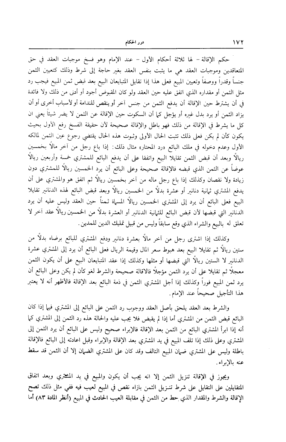 وَلَوْ كَانَ الْمَقْبُوضُ أَجْوَدَ أَوْ أَدْنَى مِنْ ذَلِكَ وَلَا فَائِدَةَ فِي أَنْ يُشْتَرَطَ حِينَ الْإِقَالَةِ أَنْ يَدْفَعَ الثَّمَنَ مِنْ جِنْسٍ آخَرَ أَوْ يَنْقُصَ لِلنَّدَامَةِ أَوْ لِأَسْبَابٍ أُخْرَى أَوْ أَنْ يُزَادَ الثَّمَنُ أَوْ يُرَدَّ بَدَلُ غَيْرِهِ أَوْ يُؤَجَّلَ كَمَا أَنَّ السُّكُوتَ حِينَ الْإِقَالَةِ عَنْ الثَّمَنِ لَا يَضُرُّ شَيْئًا يَعْنِي أَنَّ كُلَّ مَا يُشْتَرَطُ فِي الْإِقَالَةِ مِنْ ذَلِكَ فَهُوَ بَاطِلٌ وَالْإِقَالَةُ صَحِيحَةٌ؛ لِأَنَّ حَقِيقَةَ الْفَسْخِ رَفْعُ الْأَوَّلِ بِحَيْثُ يَكُونُ كَأَنْ لَمْ يَكُنْ فَعَلَى ذَلِكَ تَثْبُتُ الْحَالُ الْأُولَى وَثُبُوتُ هَذِهِ الْحَالِ يَقْتَضِي رُجُوعَ عَيْنِ الثَّمَنِ لِمَالِكِهِ الْأَوَّلِ وَعَدَمَ دُخُولِهِ فِي مِلْكِ الْبَائِعِ رَدُّ الْمُحْتَارِ ".