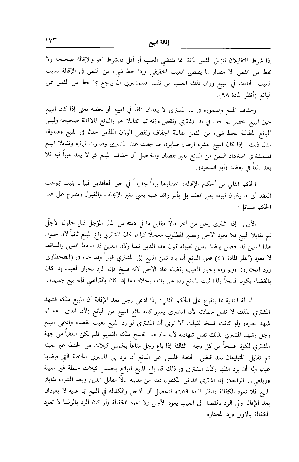 الْأُولَى: إذَا اشْتَرَى رَجُلٌ مِنْ آخَرَ مَالًا مُقَابِلَ مَا فِي ذِمَّتِهِ مِنْ الْمَالِ الْمُؤَجَّلِ قَبْلَ حُلُولِ الْأَجَلِ ثُمَّ تَقَايَلَا الْبَيْعَ فَلَا يَعُودُ الْأَجَلُ وَيَصِيرُ الْمَطْلُوبُ مُعَجَّلًا كَمَا لَوْ كَانَ الْمُشْتَرِي بَاعَ الْمَبِيعَ ثَانِيًا؛ لِأَنَّ حُلُولَ هَذَا الدَّيْنِ قَدْ حَصَلَ بِرِضَا الْمَدِينِ لِقَبُولِهِ كَوْنَ هَذَا الدَّيْنِ ثَمَنًا وَلِأَنَّ الْمَدِينَ قَدْ أَسْقَطَ الدَّيْنَ وَالسَّاقِطُ لَا يَعُودُ (اُنْظُرْ الْمَادَّةَ 51) فَعَلَى الْبَائِعِ أَنْ يَرُدَّ ثَمَنَ الْمَبِيعِ إلَى الْمُشْتَرِي فَوْرًا وَقَدْ جَاءَ فِي (الطَّحْطَاوِيِّ وَرَدِّ الْمُحْتَارِ) : " وَلَوْ رَدَّهُ بِخِيَارِ الْعَيْبِ بِقَضَاءٍ عَادَ الْأَجَلُ؛ لِأَنَّهُ فَسْخٌ فَإِنَّ الرَّدَّ بِخِيَارِ الْعَيْبِ إذَا كَانَ بِالْقَضَاءِ يَكُونُ فَسْخًا وَلِذَا ثَبَتَ لِلْبَائِعِ رَدُّهُ عَلَى بَائِعِهِ بِخِلَافِ مَا إذَا كَانَ بِالتَّرَاضِي فَإِنَّهُ بَيْعٌ جَدِيدٌ.