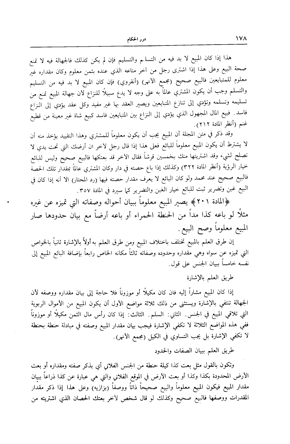 (الْمَادَّةُ 201) يَصِيرُ الْمَبِيعُ مَعْلُومًا بِبَيَانِ أَحْوَالِهِ وَصِفَاتِهِ الَّتِي تُمَيِّزُهُ عَنْ غَيْرِهِ مَثَلًا لَوْ بَاعَهُ كَذَا مُدًّا مِنْ الْحِنْطَةِ الْحَمْرَاءِ أَوْ بَاعَهُ أَرْضًا مَعَ بَيَانِ حُدُودِهَا صَارَ الْمَبِيعُ مَعْلُومًا وَصَحَّ الْبَيْعُ.
