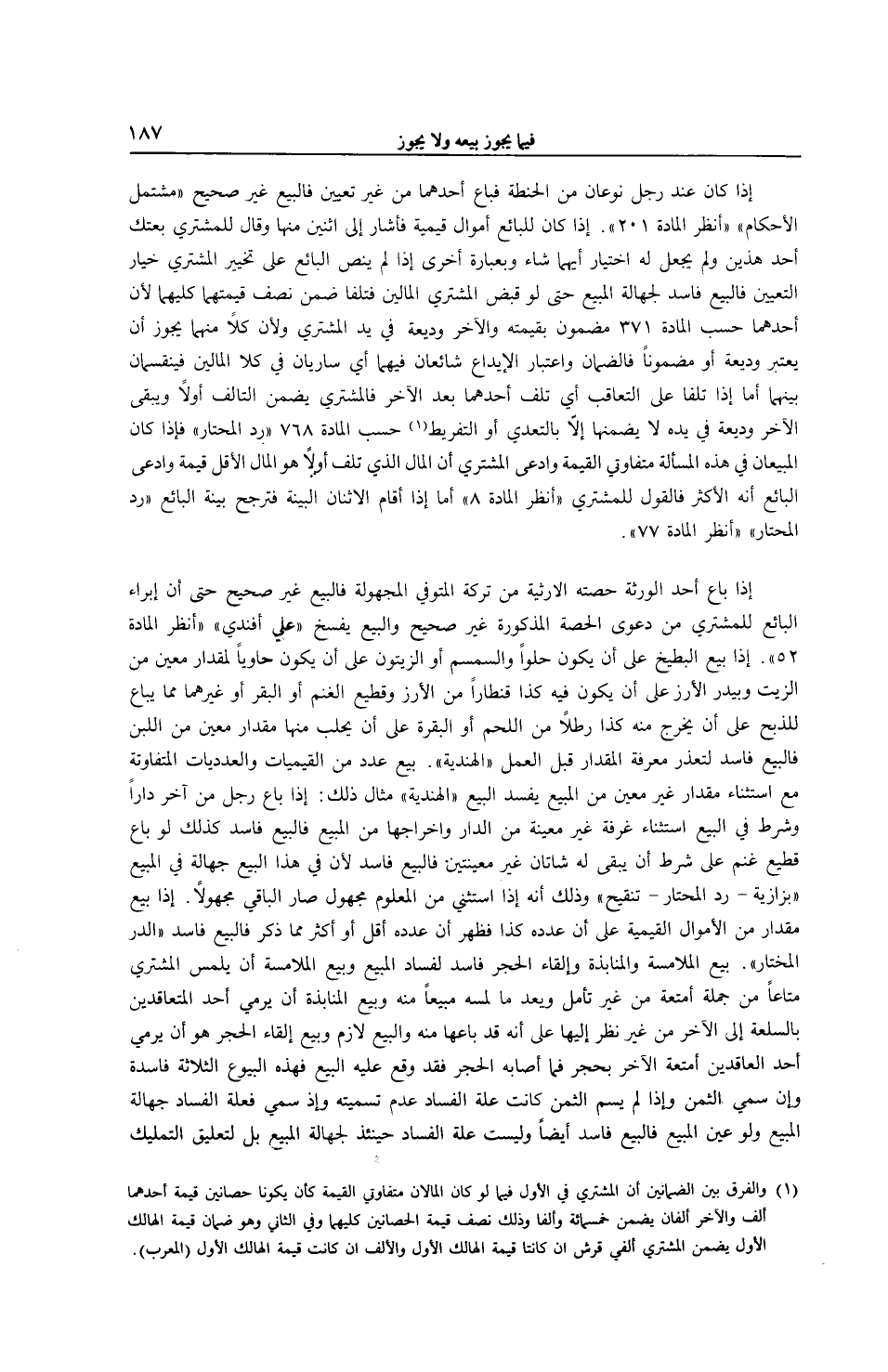 إذَا بَاعَ أَحَدُ الْوَرَثَةِ حِصَّتَهُ الْإِرْثِيَّةَ مِنْ تَرِكَةِ الْمُتَوَفَّى الْمَجْهُولَةِ فَالْبَيْعُ غَيْرُ صَحِيحٍ حَتَّى أَنَّ إبْرَاءَ الْبَائِعِ لِلْمُشْتَرِي مِنْ دَعْوَى الْحِصَّةِ الْمَذْكُورَةِ غَيْرُ صَحِيحٍ وَالْبَيْعُ يُفْسَخ عَلِيٌّ أَفَنْدِي (اُنْظُرْ الْمَادَّةَ 52) إذَا بِيعَ الْبِطِّيخُ عَلَى أَنْ يَكُونَ حُلْوًا وَالسِّمْسِمُ أَوْ الزَّيْتُونُ عَلَى أَنْ يَكُونَ حَاوِيًا لِمِقْدَارٍ مُعَيَّنٍ مِنْ الزَّيْتِ وَبَيْدَرُ الْأُرْزِ عَلَى أَنْ يَكُونَ فِيهِ كَذَا قِنْطَارًا مِنْ الْأَرُزِّ وَقَطِيعُ الْغَنَمِ أَوْ الْبَقَرِ أَوْ غَيْرِهِمَا مَا يُبَاعُ لِلذَّبْحِ عَلَى أَنْ يَخْرُجَ مِنْهُ كَذَا رِطْلًا مِنْ اللَّحْمِ أَوْ الْبَقَرَةُ عَلَى أَنْ يُحْلَبَ مِنْهَا مِقْدَارٌ مُعَيَّنٌ مِنْ اللَّبَنِ فَالْبَيْعُ فَاسِدٌ لِتَعَذُّرِ مَعْرِفَةِ الْمِقْدَارِ قَبْلَ الْعَمَلِ (الْهِنْدِيَّةُ) . بَيْعُ عَدَدٍ مِنْ الْقِيَمِيَّاتِ وَالْعَدَدِيَّاتِ الْمُتَفَاوِتَةِ مَعَ اسْتِثْنَاءِ مِقْدَارٍ غَيْرِ مُعَيَّنٍ مِنْ الْمَبِيعِ يُفْسِدُ الْبَيْعَ (الْهِنْدِيَّةُ) مِثَالُ ذَلِكَ: إذَا بَاعَ رَجُلٌ مِنْ آخَرَ دَارًا وَشَرَطَ فِي الْبَيْعِ اسْتِثْنَاءَ غُرْفَةٍ غَيْرِ مُعَيَّنَةٍ مِنْ الدَّارِ وَإِخْرَاجَهَا مِنْ الْمَبِيعِ فَالْبَيْعُ فَاسِدٌ كَذَلِكَ لَوْ بَاعَ قَطِيعَ غَنَمٍ عَلَى شَرْطِ أَنْ يَبْقَى لَهُ شَاتَانِ غَيْرُ مُعَيَّنَتَيْنِ فَالْبَيْعُ فَاسِدٌ؛ لِأَنَّ فِي هَذَا الْبَيْعِ جَهَالَةً فِي الْمَبِيعِ بَزَّازِيَّةٌ - رَدُّ الْمُحْتَارِ - (تَنْقِيحٌ) وَذَلِكَ أَنَّهُ إذَا اُسْتُثْنِيَ مِنْ الْمَعْلُومِ مَجْهُولٌ صَارَ الْبَاقِي مَجْهُولًا.