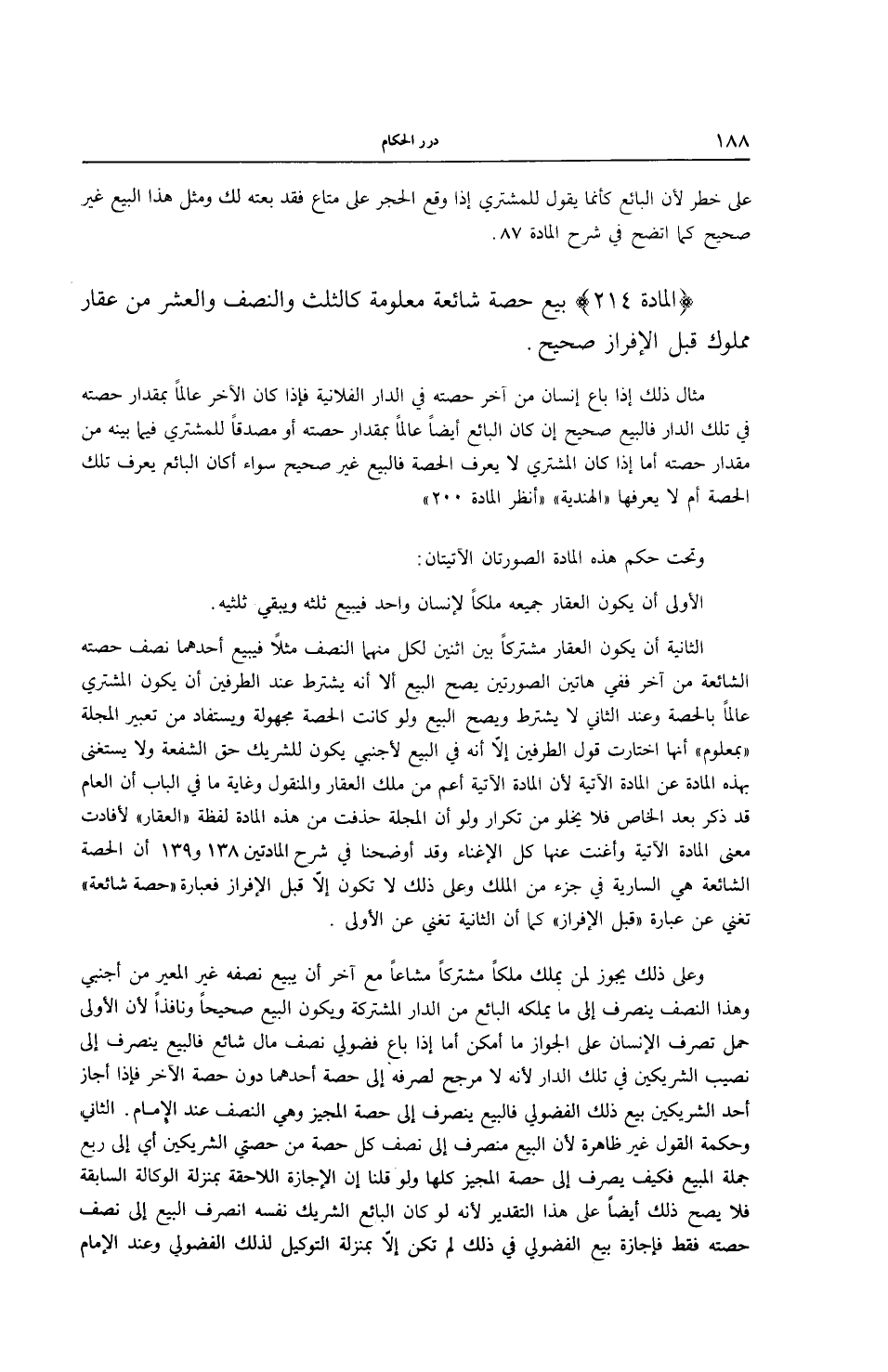 (بِمَعْلُومٍ) أَنَّهَا اخْتَارَتْ قَوْلَ الطَّرَفَيْنِ إلَّا أَنَّهُ فِي الْبَيْعِ لِأَجْنَبِيٍّ يَكُونُ لِلشَّرِيكِ حَقُّ الشُّفْعَةِ وَلَا يُسْتَغْنَى بِهَذِهِ الْمَادَّةِ عَنْ الْمَادَّةِ الْآتِيَةِ؛ لِأَنَّ الْمَادَّةَ الْآتِيَةَ أَعَمُّ مِنْ مِلْكِ الْعَقَارِ وَالْمَنْقُولِ وَغَايَةُ مَا فِي الْبَابِ أَنَّ الْعَامَّ قَدْ ذُكِرَ بَعْدَ الْخَاصِّ فَلَا يَخْلُو مِنْ تَكْرَارٍ وَلَوْ أَنَّ الْمَجَلَّةَ حَذَفَتْ مِنْ هَذِهِ الْمَادَّةِ لَفْظَةَ (الْعَقَارِ) لَأَفَادَتْ مَعْنَى الْمَادَّةِ الْآتِيَةِ وَأَغْنَتْ عَنْهَا كُلَّ الْإِغْنَاءِ وَقَدْ أَوْضَحْنَا فِي شَرْحِ الْمَادَّتَيْنِ 138 و 139 أَنَّ الْحِصَّةَ الشَّائِعَةَ هِيَ السَّارِيَةُ فِي جُزْءٍ مِنْ الْمِلْكِ وَعَلَى ذَلِكَ لَا تَكُونُ إلَّا قَبْلَ الْإِفْرَازِ فَعِبَارَةُ (حِصَّةٍ شَائِعَةٍ) تُغْنِي عَنْ عِبَارَةِ (قَبْلَ الْإِفْرَازِ) كَمَا أَنَّ الثَّانِيَةَ تُغْنِي عَنْ الْأُولَى.
