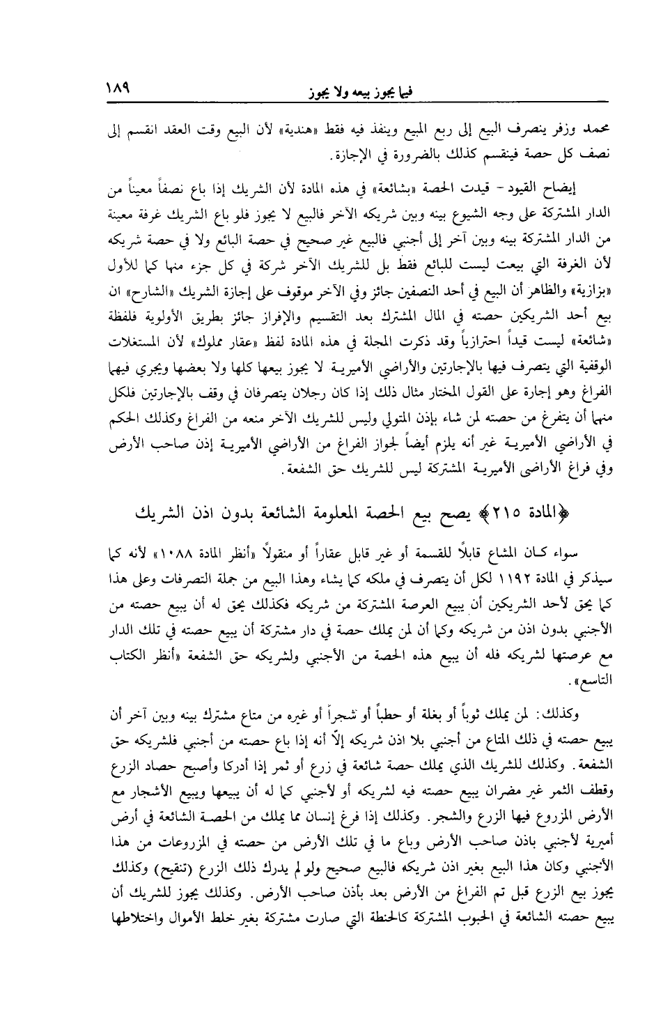 (الْمَادَّةُ 215) يَصِحُّ بَيْعُ الْحِصَّةِ الْمَعْلُومَةِ الشَّائِعَةِ بِدُونِ إذْنِ الشَّرِيكِ سَوَاءٌ كَانَ الْمَشَاعُ قَابِلًا لِلْقِسْمَةِ أَوْ غَيْرَ قَابِلٍ عَقَارًا أَوْ مَنْقُولًا (اُنْظُرْ الْمَادَّةَ 1088) لِأَنَّهُ كَمَا سَيُذْكَرُ فِي الْمَادَّةِ 1192 لِكُلٍّ أَنْ يَتَصَرَّفَ فِي مِلْكِهِ كَمَا يَشَاءُ وَهَذَا الْبَيْعُ مِنْ جُمْلَةِ التَّصَرُّفَاتِ وَعَلَى هَذَا كَمَا يَحِقُّ لِأَحَدِ الشَّرِيكَيْنِ أَنْ يَبِيعَ الْعَرْصَةَ الْمُشْتَرَكَةَ مِنْ شَرِيكِهِ فَكَذَلِكَ يَحِقُّ لَهُ أَنْ يَبِيعَ حِصَّتَهُ مِنْ الْأَجْنَبِيِّ بِدُونِ إذْنٍ مِنْ شَرِيكِهِ وَكَمَا أَنَّ لِمَنْ يَمْلِكُ حِصَّةً فِي دَارٍ مُشْتَرَكَةٍ أَنْ يَبِيعَ حِصَّتَهُ فِي تِلْكَ الدَّارِ مَعَ عَرْصَتِهَا لِشَرِيكِهِ فَلَهُ أَنْ يَبِيعَ هَذِهِ الْحِصَّةَ مِنْ الْأَجْنَبِيِّ وَلِشَرِيكِهِ حَقُّ الشُّفْعَةِ (اُنْظُرْ الْكِتَابَ التَّاسِعَ) .
