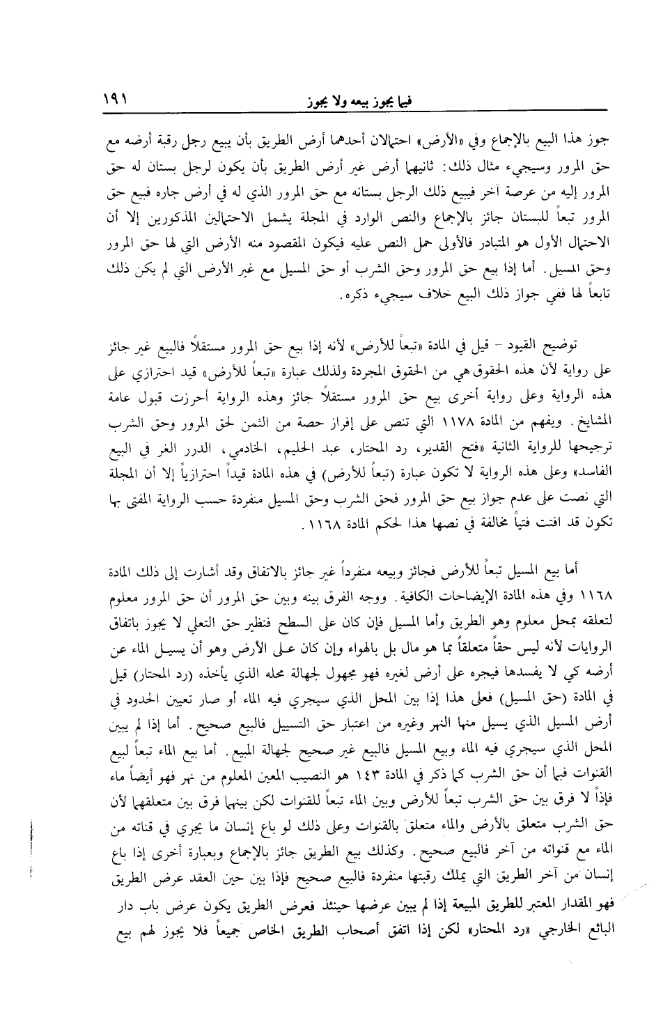 تَوْضِيحُ الْقُيُودِ - قِيلَ فِي الْمَادَّةِ (تَبَعًا لِلْأَرْضِ) لِأَنَّهُ إذَا بِيعَ حَقُّ الْمُرُورِ مُسْتَقِلًّا فَالْبَيْعُ غَيْرُ جَائِزٍ عَلَى رِوَايَةٍ؛ لِأَنَّ هَذِهِ الْحُقُوقَ هِيَ مِنْ الْحُقُوقِ الْمُجَرَّدَةِ وَلِذَلِكَ عِبَارَةُ (تَبَعًا لِلْأَرْضِ) قَيْدٌ احْتِرَازِيٌّ عَلَى هَذِهِ الرِّوَايَةِ وَعَلَى رِوَايَةٍ أُخْرَى بَيْعُ حَقِّ الْمُرُورِ مُسْتَقِلًّا جَائِزٌ وَهَذِهِ الرِّوَايَةُ أَحْرَزَتْ قَبُولَ عَامَّةِ الْمَشَايِخِ وَيُفْهَمُ مِنْ الْمَادَّةِ 1781 الَّتِي تَنُصُّ عَلَى إفْرَازِ حِصَّةٍ مِنْ الثَّمَنِ لِحَقِّ الْمُرُورِ وَحَقِّ الشُّرْبِ تَرْجِيحُهَا لِلرِّوَايَةِ الثَّانِيَةِ (فَتْحُ الْقَدِيرِ، رَدُّ الْمُحْتَارِ عَبْدُ الْحَلِيمِ، الْخَادِمِيُّ الدُّرَرُ الْغَرُّ فِي الْبَيْعِ الْفَاسِدِ) وَعَلَى هَذِهِ الرِّوَايَةِ لَا تَكُونُ عِبَارَةُ (تَبَعًا لِلْأَرْضِ) فِي هَذِهِ الْمَادَّةِ قَيْدًا احْتِرَازِيًّا إلَّا أَنَّ الْمَجَلَّةَ الَّتِي نَصَّتْ عَلَى عَدَمِ جَوَازِ بَيْعِ حَقِّ الْمُرُورِ، فَحَقُّ الشُّرْبِ وَحَقُّ الْمَسِيلِ مُنْفَرِدَةٌ حَسَبَ الرِّوَايَةِ الْمُفْتَى بِهَا تَكُونُ قَدْ أَفْتَتْ فُتْيَا مُخَالِفَةً فِي نَصِّهَا هَذَا لِحُكْمِ الْمَادَّةِ 168 1.