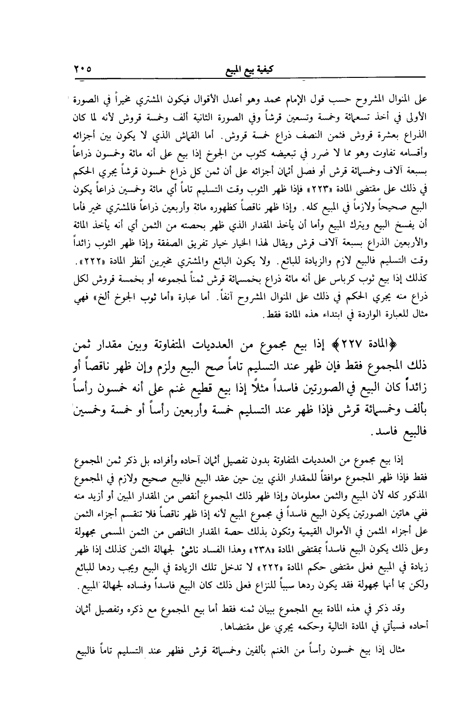 (الْمَادَّةُ 227) إذَا بِيعَ مَجْمُوعٌ مِنْ الْعَدَدِيَّاتِ الْمُتَفَاوِتَةِ وَبُيِّنَ مِقْدَارُ ثَمَنِ ذَلِكَ الْمَجْمُوعِ فَقَطْ فَإِنْ ظَهَرَ عِنْدَ التَّسْلِيمِ تَامًّا صَحَّ الْبَيْعُ وَلَزِمَ وَإِنْ ظَهَرَ نَاقِصًا أَوْ زَائِدًا كَانَ الْبَيْعُ فِي الصُّورَتَيْنِ فَاسِدًا مَثَلًا إذَا بِيعَ قَطِيعُ غَنَمٍ عَلَى أَنَّهُ خَمْسُونَ رَأْسًا بِأَلْفٍ وَخَمْسِمِائَةِ قِرْشٍ فَإِذَا ظَهَرَ عِنْدَ التَّسْلِيمِ خَمْسَةً وَأَرْبَعِينَ رَأْسًا أَوْ خَمْسَةً وَخَمْسِينَ فَالْبَيْعُ فَاسِدٌ إذَا بِيعَ مَجْمُوعٌ مِنْ الْعَدَدِيَّاتِ الْمُتَفَاوِتَةِ بِدُونِ تَفْصِيلِ أَثْمَانِ آحَادِهِ وَأَفْرَادِهِ بَلْ ذَكَرَ ثَمَنَ الْمَجْمُوعِ فَقَطْ فَإِذَا ظَهَرَ الْمَجْمُوعُ مُوَافِقًا لِلْمِقْدَارِ الَّذِي بُيِّنَ حِينَ عَقْدِ الْبَيْعِ فَالْبَيْعُ صَحِيحٌ وَلَازِمٌ فِي الْمَجْمُوعِ الْمَذْكُورِ كُلِّهِ؛ لِأَنَّ الْمَبِيعَ وَالثَّمَنَ مَعْلُومَانِ وَإِذَا ظَهَرَ ذَلِكَ الْمَجْمُوعُ أَنْقَصَ مِنْ الْمِقْدَارِ الْمُبَيَّنِ أَوْ أَزْيَدَ مِنْهُ فَفِي هَاتَيْنِ الصُّورَتَيْنِ يَكُونُ الْبَيْعُ فَاسِدًا فِي مَجْمُوعِ الْمَبِيعِ؛ لِأَنَّهُ إذَا ظَهَرَ نَاقِصًا فَلَا تَنْقَسِمُ أَجْزَاءُ الثَّمَنِ عَلَى أَجْزَاءِ الْمُثَمَّنِ فِي الْأَمْوَالِ الْقِيَمِيَّةِ وَتَكُونُ بِذَلِكَ حِصَّةُ الْمِقْدَارِ النَّاقِصِ مِنْ الثَّمَنِ الْمُسَمَّى مَجْهُولَةً وَعَلَى ذَلِكَ يَكُونُ الْبَيْعُ فَاسِدًا بِمُقْتَضَى الْمَادَّةِ (238) وَهَذَا الْفَسَادُ نَاشِئٌ لِجَهَالَةِ الثَّمَنِ كَذَلِكَ إذَا ظَهَرَ زِيَادَةٌ فِي الْمَبِيعِ فَعَلَى مُقْتَضَى حُكْمِ الْمَادَّةِ (222) لَا تَدْخُلُ تِلْكَ الزِّيَادَةُ فِي الْبَيْعِ وَيَجِبُ رَدُّهَا لِلْبَائِعِ وَلَكِنْ بِمَا أَنَّهَا مَجْهُولَةٌ فَقَدْ يَكُونُ رَدُّهَا سَبَبًا لِلنِّزَاعِ فَعَلَى ذَلِكَ كَانَ الْبَيْعُ فَاسِدًا وَفَسَادُهُ لِجَهَالَةِ الْمَبِيعِ. وَقَدْ ذَكَرَ فِي هَذِهِ الْمَادَّةِ بَيْعَ الْمَجْمُوعِ بِبَيَانِ ثَمَنِهِ فَقَطْ أَمَّا بَيْعُ الْمَجْمُوعِ مَعَ ذِكْرِهِ وَتَفْصِيلُ أَثْمَانِ آحَادِهِ فَسَيَأْتِي فِي الْمَادَّةِ التَّالِيَةِ وَحُكْمُهُ يَجْرِي عَلَى مُقْتَضَاهَا.
