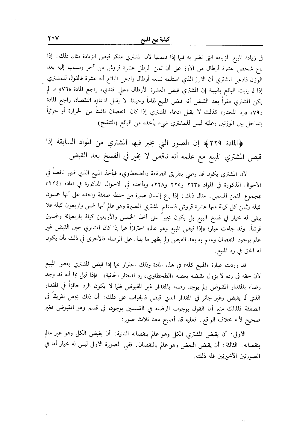 (الْمَادَّةُ 229) إنَّ الصُّوَرَ الَّتِي يُخَيَّرُ فِيهَا الْمُشْتَرِي مِنْ الْمَوَادِّ السَّابِقَةِ إذَا قَبَضَ الْمُشْتَرِي الْمَبِيعَ مَعَ عِلْمِهِ أَنَّهُ نَاقِصٌ لَا يُخَيَّرُ فِي الْفَسْخِ بَعْدَ الْقَبْضِ.