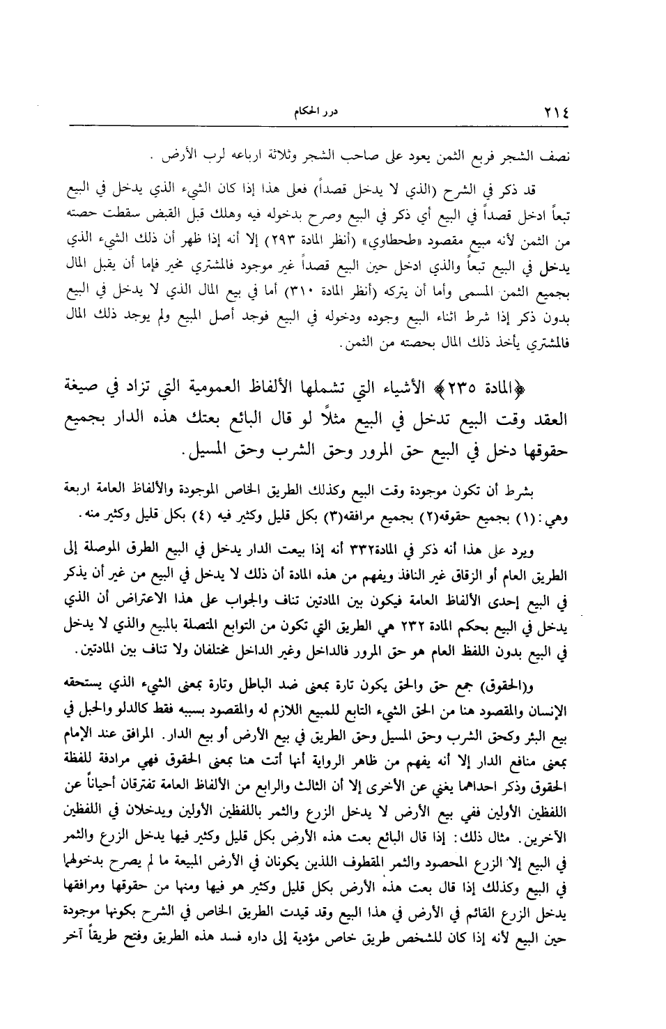 وَيَرِدُ عَلَى هَذَا أَنَّهُ ذَكَرَ فِي الْمَادَّةِ 332 أَنَّهُ إذَا بِيعَتْ الدَّارُ يَدْخُلُ فِي الْبَيْعِ الطُّرُقُ الْمُوَصِّلَةُ إلَى الطَّرِيقِ الْعَامِّ أَوْ الزُّقَاقُ غَيْرُ النَّافِذِ وَيُفْهَمُ مِنْ هَذِهِ الْمَادَّةِ أَنَّ ذَلِكَ لَا يَدْخُلُ فِي الْبَيْعِ وَمِنْ غَيْرِ أَنْ يَذْكُرَ فِي الْبَيْعِ إحْدَى الْأَلْفَاظِ الْعَامَّةِ فَيَكُونُ بَيْنَ الْمَادَّتَيْنِ تَنَافٍ وَالْجَوَابُ عَلَى هَذَا الِاعْتِرَاضِ أَنَّ الَّذِي يَدْخُلُ فِي الْبَيْعِ بِحُكْمِ الْمَادَّةِ 232 هِيَ الطَّرِيقُ الَّتِي تَكُونُ مِنْ التَّوَابِعِ الْمُتَّصِلَةِ بِالْمَبِيعِ وَاَلَّذِي لَا يَدْخُلُ فِي الْبَيْعِ بِدُونِ اللَّفْظِ الْعَامِّ هُوَ حَقُّ الْمُرُورِ فَالدَّاخِلُ وَغَيْرُ الدَّاخِلِ مُخْتَلِفَانِ وَلَا تَنَافٍ بَيْنَ الْمَادَّتَيْنِ.