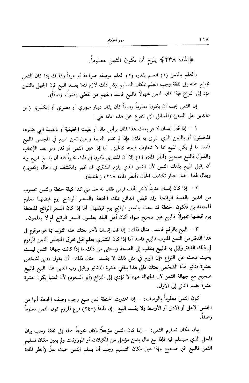 [ (الْمَادَّةُ 238) كون الثَّمَن مَعْلُومًا]