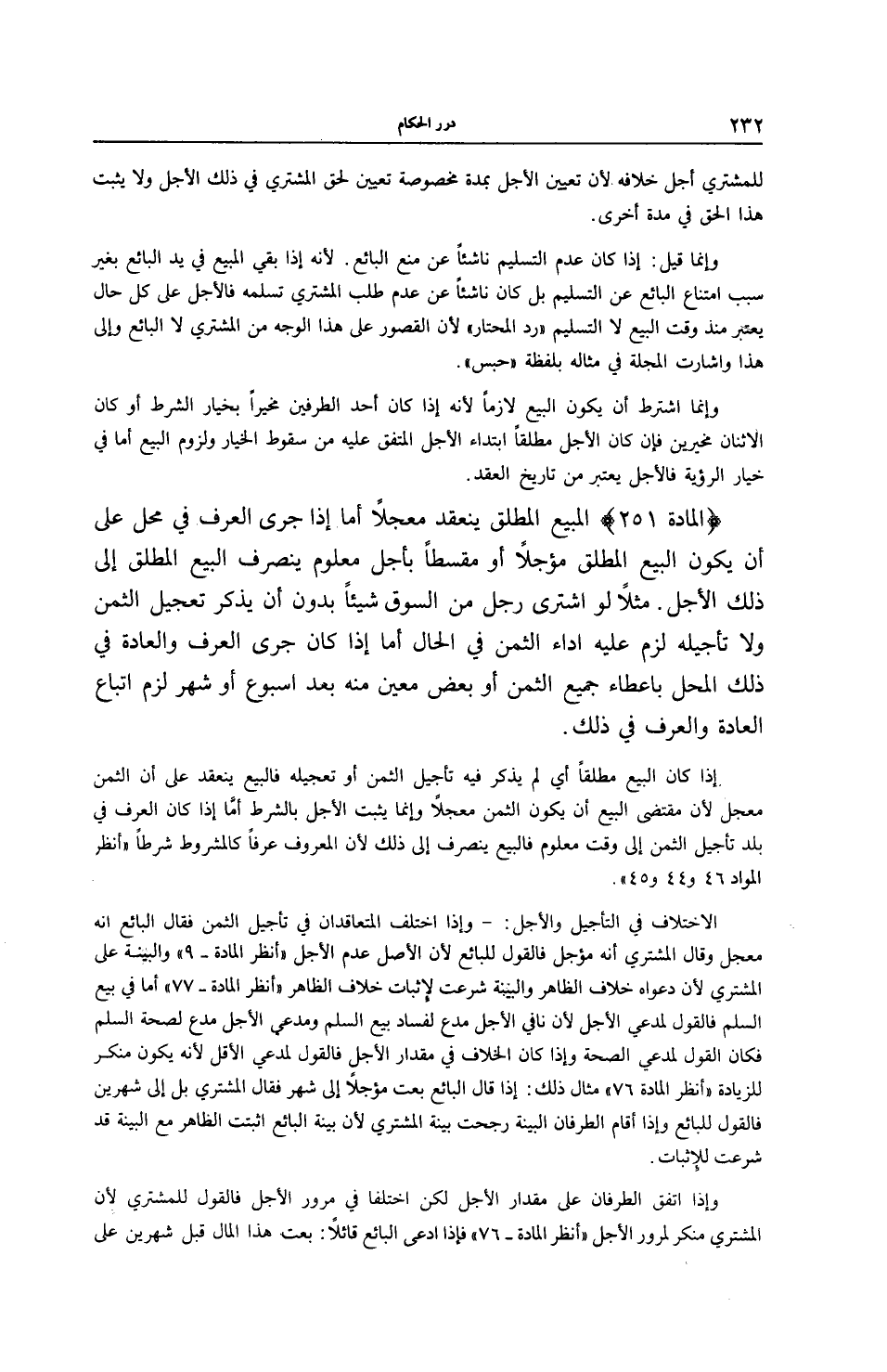 (الْمَادَّةُ 251) الْمَبِيعُ الْمُطْلَقُ يَنْعَقِدُ مُعَجَّلًا أَمَّا إذَا جَرَى الْعُرْفُ فِي مَحَلٍّ عَلَى أَنْ يَكُونَ الْبَيْعُ الْمُطْلَقُ مُؤَجَّلًا أَوْ مُقَسَّطًا بِأَجَلٍ مَعْلُومٍ يَنْصَرِفُ الْبَيْعُ الْمُطْلَقُ إلَى ذَلِكَ الْأَجَلِ. مَثَلًا لَوْ اشْتَرَى رَجُلٌ مِنْ السُّوقِ شَيْئًا بِدُونِ أَنْ يُذْكَرَ تَعْجِيلُ الثَّمَنِ وَلَا تَأْجِيلُهُ لَزِمَ عَلَيْهِ أَدَاءُ الثَّمَنِ فِي الْحَالِ أَمَّا إذَا كَانَ جَرَى الْعُرْفُ وَالْعَادَةُ فِي ذَلِكَ الْمَحَلِّ بِإِعْطَاءِ جَمِيعِ الثَّمَنِ أَوْ بَعْضٍ مُعَيَّنٍ مِنْهُ بَعْدَ أُسْبُوعٍ أَوْ شَهْرٍ لَزِمَ اتِّبَاعُ الْعَادَةِ وَالْعُرْفِ فِي ذَلِكَ إذَا كَانَ الْبَيْعُ مُطْلَقًا أَيْ لَمْ يُذْكَرْ فِيهِ تَأْجِيلُ الثَّمَنِ أَوْ تَعْجِيلُهُ فَالْبَيْعُ يَنْعَقِدُ عَلَى أَنَّ الثَّمَنَ مُعَجَّلٌ لِأَنَّ مُقْتَضَى الْبَيْعِ أَنْ يَكُونَ الثَّمَنُ مُعَجَّلًا وَإِنَّمَا يَثْبُتُ الْأَجَلُ بِالشَّرْطِ أَمَّا إذَا كَانَ الْعُرْفُ فِي بَلَدٍ تَأْجِيلَ الثَّمَنِ إلَى وَقْتٍ مَعْلُومٍ فَالْبَيْعُ يَنْصَرِفُ إلَى ذَلِكَ لِأَنَّ الْمَعْرُوفَ عُرْفًا كَالْمَشْرُوطِ شَرْطًا (اُنْظُرْ الْمَوَادَّ 46 و 44 و 54) . الِاخْتِلَافُ فِي التَّأْجِيلِ وَالْأَجَلِ: - وَإِذَا اخْتَلَفَ الْمُتَعَاقِدَانِ فِي تَأْجِيلِ الثَّمَنِ فَقَالَ الْبَائِعُ إنَّهُ مُعَجَّلٌ وَقَالَ الْمُشْتَرِي أَنَّهُ مُؤَجَّلٌ فَالْقَوْلُ لِلْبَائِعِ لِأَنَّ الْأَصْلَ عَدَمُ الْأَجَلِ (اُنْظُرْ الْمَادَّةَ - 9) وَالْبَيِّنَةُ عَلَى الْمُشْتَرِي لِأَنَّ دَعْوَاهُ خِلَافُ الظَّاهِرِ وَالْبَيِّنَةُ شُرِعَتْ لِإِثْبَاتِ خِلَافِ الظَّاهِرِ (اُنْظُرْ الْمَادَّةَ - 77) أَمَّا فِي بَيْعِ السَّلَمِ فَالْقَوْلُ لِمُدَّعِي الْأَجَلِ لِأَنَّ نَافِي الْأَجَلِ مُدَّعٍ لِفَسَادِ بَيْعِ السَّلَمِ، وَمُدَّعِي الْأَجَلِ مُدَّعٍ لِصِحَّةِ السَّلَمِ فَكَانَ الْقَوْلُ لِمُدَّعِي الصِّحَّةِ، وَإِذَا كَانَ الْخِلَافُ فِي مِقْدَارِ الْأَجَلِ فَالْقَوْلُ لِمُدَّعِي الْأَقَلِّ لِأَنَّهُ يَكُونُ مُنْكِرًا لِلزِّيَادَةِ (اُنْظُرْ الْمَادَّةَ 76) .