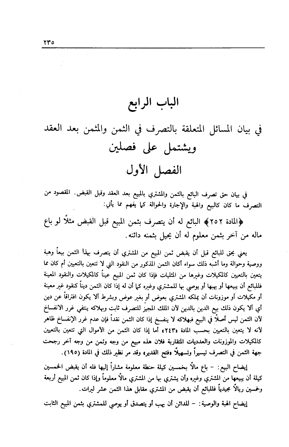 الْفَصْلُ الْأَوَّلُ: فِي بَيَانِ حَقِّ تَصَرُّفِ الْبَائِعِ بِالثَّمَنِ وَالْمُشْتَرِي بِالْمَبِيعِ بَعْدَ الْعَقْدِ وَقَبْلَ الْقَبْضِ. الْمَقْصُودُ مِنْ التَّصَرُّفِ مَا كَانَ كَالْبَيْعِ وَالْهِبَةِ وَالْإِجَارَةِ وَالْحَوَالَةِ كَمَا يُفْهَمُ مَا يَأْتِي: (الْمَادَّةُ 252) الْبَائِعُ لَهُ أَنْ يَتَصَرَّفَ بِثَمَنِ الْمَبِيعِ قَبْلَ الْقَبْضِ مَثَلًا لَوْ بَاعَ مَالَهُ مِنْ آخَرَ بِثَمَنٍ مَعْلُومٍ لَهُ أَنْ يُحِيلَ بِثَمَنِهِ دَائِنَهُ. يَعْنِي يَحِقُّ لِلْبَائِعِ قَبْلَ أَنْ يَقْبِضَ ثَمَنَ الْمَبِيعِ مِنْ الْمُشْتَرِي أَنْ يَتَصَرَّفَ بِهَذَا الثَّمَنِ بَيْعًا وَهِبَةً وَوَصِيَّةً وَحَوَالَةً وَمَا أَشْبَهَ ذَلِكَ سَوَاءٌ أَكَانَ الثَّمَنُ الْمَذْكُورُ مِنْ النُّقُودِ الَّتِي لَا تَتَعَيَّنُ بِالتَّعْيِينِ أَمْ كَانَ مِمَّا يَتَعَيَّنُ بِالتَّعْيِينِ كَالْمَكِيلَاتِ وَغَيْرِهَا مِنْ الْمِثْلِيَّاتِ فَإِذَا كَانَ ثَمَنُ الْمَبِيعِ عَيْنًا كَالْمَكِيلَاتِ وَالنُّقُودِ الْمُعَيَّنَةِ فَلِلْبَائِعِ أَنْ يَبِيعَهَا أَوْ يَهَبَهَا أَوْ يُوصِيَ بِهَا لِلْمُشْتَرِي وَغَيْرِهِ كَمَا أَنَّ لَهُ إذَا كَانَ الثَّمَنُ دَيْنًا كَنُقُودٍ غَيْرِ مُعَيَّنَةٍ أَوْ مَكِيلَاتٍ أَوْ مَوْزُونَاتٍ أَنْ يُمَلِّكَهُ الْمُشْتَرِي بِعِوَضٍ أَوْ بِغَيْرِ عِوَضٍ وَبِشَرْطِ أَلَّا يَكُونَ افْتِرَاقًا عَنْ دَيْنٍ أَيْ أَلَّا يَكُونَ ذَلِكَ بَيْعَ الدَّيْنِ بِالدَّيْنِ لِأَنَّ الْمِلْكَ الْمُجِيزَ لِلتَّصَرُّفِ ثَابِتٌ وَبِهَلَاكِهِ يَنْتَفِي غَرَرُ الِانْفِسَاخِ لِأَنَّ الثَّمَنَ لَيْسَ أَصْلًا فِي الْبَيْعِ فَبِهَلَاكِهِ لَا يَنْفَسِخُ إذَا كَانَ الثَّمَنُ نَقْدًا فَإِنَّ عَدَمَ غَرَرِ الِانْفِسَاخِ ظَاهِرٌ لِأَنَّهُ لَا يَتَعَيَّنُ بِالتَّعْيِينِ بِحَسَبِ الْمَادَّةِ (243) ، أَمَّا إذَا كَانَ الثَّمَنُ مِنْ الْأَمْوَالِ الَّتِي تَتَعَيَّنُ بِالتَّعْيِينِ كَالْمَكِيلَاتِ وَالْمَوْزُونَاتِ وَالْعَدَدِيَّاتِ الْمُتَقَارِبَةِ فَلِأَنَّ هَذِهِ مَبِيعٌ مِنْ وَجْهٍ وَثَمَنٌ مِنْ وَجْهٍ آخَرَ رُجِّحَتْ جِهَةُ الثَّمَنِ فِي التَّصَرُّفِ تَيْسِيرًا وَتَسْهِيلًا (فَتْحُ الْقَدِيرِ) وَقَدْ مَرَّ نَظِيرُ ذَلِكَ فِي الْمَادَّةِ (195) .