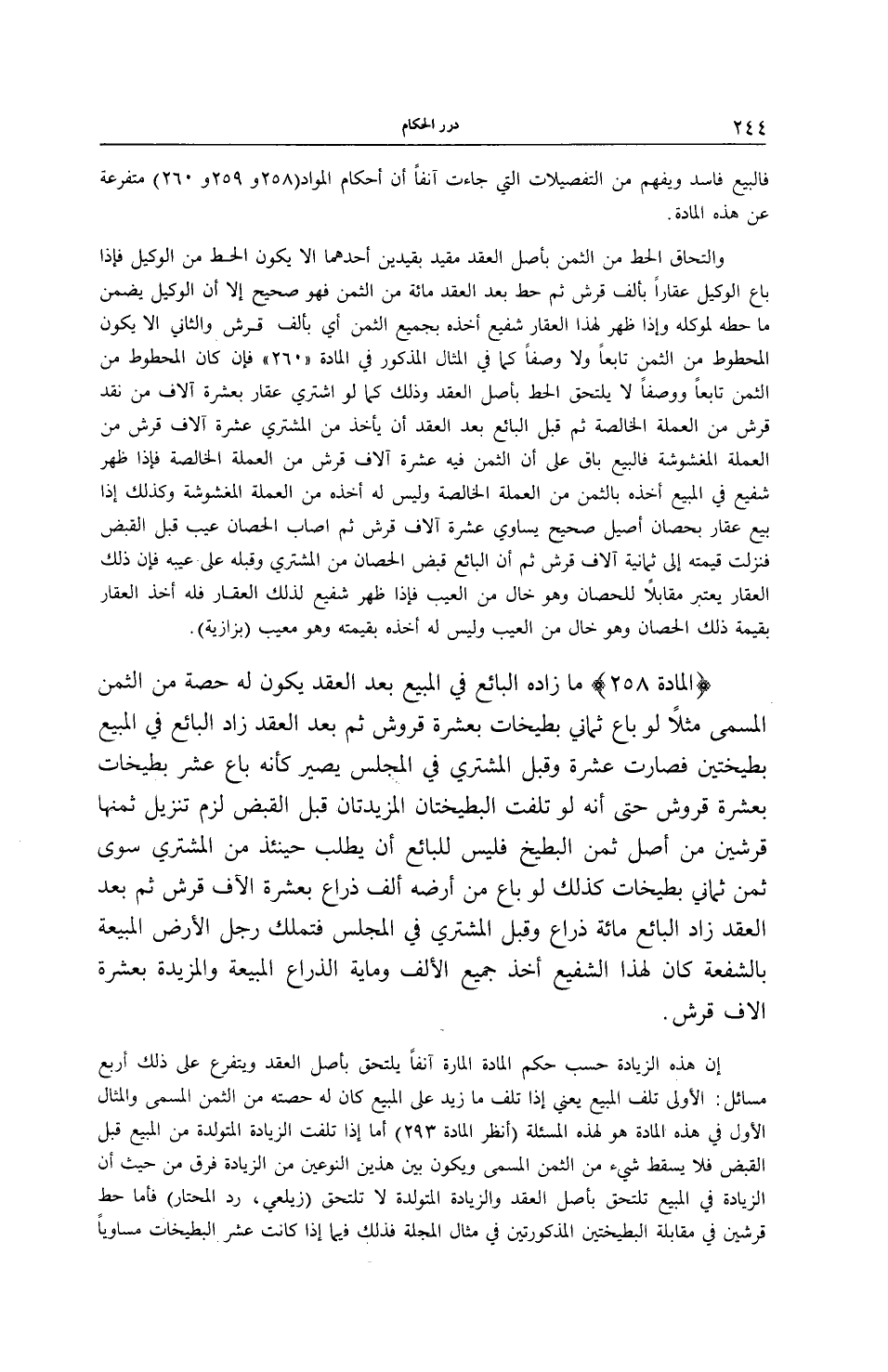 فَالْبَيْعُ فَاسِدٌ وَيُفْهَمُ مِنْ التَّفْصِيلَاتِ الَّتِي جَاءَتْ آنِفًا أَنَّ أَحْكَامَ الْمَوَادِّ (258 و 259 و 0 26) مُتَفَرِّعَةٌ عَنْ هَذِهِ الْمَادَّةِ. وَالْتِحَاقُ الْحَطِّ مِنْ الثَّمَنِ بِأَصْلِ الْعَقْدِ مُقَيَّدٌ بِقَيْدَيْنِ أَحَدُهُمَا أَلَّا يَكُونَ الْحَطُّ مِنْ الْوَكِيلِ فَإِذَا بَاعَ الْوَكِيلُ عَقَارًا بِأَلْفِ قِرْشٍ ثُمَّ حَطَّ بَعْدَ الْعَقْدِ مِائَةً مِنْ الثَّمَنِ فَهُوَ صَحِيحٌ إلَّا أَنَّ الْوَكِيلَ يَضْمَنُ مَا حَطَّهُ لِمُوَكِّلِهِ وَإِذَا ظَهَرَ لِهَذَا الْعَقَارِ شَفِيعٌ أَخَذَهُ بِجَمِيعِ الثَّمَنِ أَيْ بِأَلْفِ قِرْشٍ وَالثَّانِي أَلَّا يَكُونَ الْمَحْطُوطُ مِنْ الثَّمَنِ تَابِعًا وَلَا وَصْفًا كَمَا فِي الْمِثَالِ الْمَذْكُورِ فِي الْمَادَّةِ (0 26) فَإِنْ كَانَ الْمَحْطُوطُ مِنْ الثَّمَنِ تَابِعًا وَوَصْفًا لَا يَلْتَحِقُ الْحَطُّ بِأَصْلِ الْعَقْدِ وَذَلِكَ كَمَا لَوْ اُشْتُرِيَ عَقَارٌ بِعَشَرَةِ آلَافٍ مِنْ نَقْدِ قِرْشٍ مِنْ الْعُمْلَةِ الْخَالِصَةِ ثُمَّ قَبِلَ الْبَائِعُ بَعْدَ الْعَقْدِ أَنْ يَأْخُذَ مِنْ الْمُشْتَرِي عَشَرَةَ آلَافِ قِرْشٍ مِنْ الْعُمْلَةِ الْمَغْشُوشَةِ فَالْبَيْعُ بَاقٍ عَلَى أَنَّ الثَّمَنَ فِيهِ عَشَرَةُ آلَافِ قِرْشٍ مِنْ الْعُمْلَةِ الْخَالِصَةِ فَإِذَا ظَهَرَ شَفِيعٌ فِي الْمَبِيعِ أَخَذَهُ بِالثَّمَنِ مِنْ الْعُمْلَةِ الْخَالِصَةِ وَلَيْسَ لَهُ أَخْذُهُ مِنْ الْعُمْلَةِ الْمَغْشُوشَةِ وَكَذَلِكَ إذَا بِيعَ عَقَارٌ بِحِصَانٍ أَصِيلٍ صَحِيحٍ يُسَاوِي عَشَرَةَ آلَافِ قِرْشٍ ثُمَّ أَصَابَ الْحِصَانَ عَيْبٌ قَبْلَ الْقَبْضِ فَنَزَلَتْ قِيمَتُهُ إلَى ثَمَانِيَةِ آلَافِ قِرْشٍ ثُمَّ أَنَّ الْبَائِعَ قَبَضَ الْحِصَانَ مِنْ الْمُشْتَرِي وَقَبِلَهُ عَلَى عَيْبِهِ فَإِنَّ ذَلِكَ الْعَقَارَ يُعْتَبَرُ مُقَابِلًا لِلْحِصَانِ وَهُوَ خَالٍ مِنْ الْعَيْبِ فَإِذَا ظَهَرَ شَفِيعٌ لِذَلِكَ الْعَقَارِ فَلَهُ أَخْذُ الْعَقَارِ بِقِيمَةِ ذَلِكَ الْحِصَانِ وَهُوَ خَالٍ مِنْ الْعَيْبِ وَلَيْسَ لَهُ أَخْذُهُ بِقِيمَتِهِ وَهُوَ مَعِيبٌ (بَزَّازِيَّةٌ) .