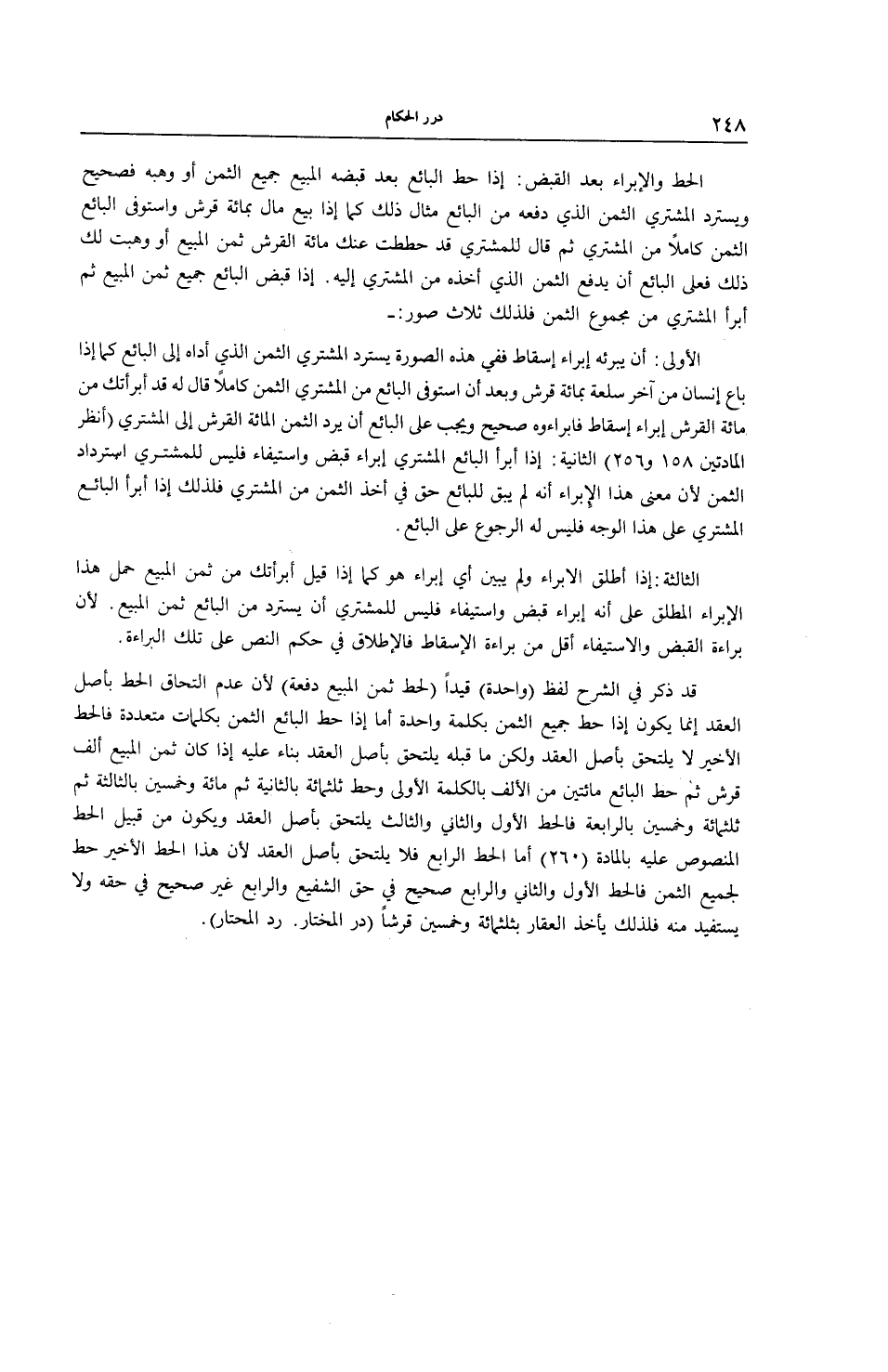 - الْأُولَى: أَنْ يُبْرِئَهُ إبْرَاءَ إسْقَاطٍ فَفِي هَذِهِ الصُّورَةِ يَسْتَرِدُّ الْمُشْتَرِي الثَّمَنَ الَّذِي أَدَّاهُ إلَى الْبَائِعِ كَمَا إذَا بَاعَ إنْسَانٌ مِنْ آخَرَ سِلْعَةً بِمِائَةِ قِرْشٍ وَبَعْدَ أَنْ اسْتَوْفَى الْبَائِعُ مِنْ الْمُشْتَرِي الثَّمَنَ كَامِلًا قَالَ لَهُ قَدْ أَبْرَأْتُك مِنْ مِائَةِ الْقِرْشِ إبْرَاءَ إسْقَاطٍ فَإِبْرَاؤُهُ صَحِيحٌ وَيَجِبُ عَلَى الْبَائِعِ أَنْ يَرُدَّ الثَّمَنَ الْمِائَةَ الْقِرْشِ إلَى الْمُشْتَرِي (اُنْظُرْ الْمَادَّتَيْنِ 158 و 256) الثَّانِيَةُ: إذَا أَبْرَأَ الْبَائِعُ الْمُشْتَرِي إبْرَاءَ قَبْضٍ وَاسْتِيفَاءٍ فَلَيْسَ لِلْمُشْتَرِي اسْتِرْدَادُ الثَّمَنِ لِأَنَّ مَعْنَى هَذَا الْإِبْرَاءِ أَنَّهُ لَمْ يَبْقَ لِلْبَائِعِ حَقٌّ فِي أَخْذِ الثَّمَنِ مِنْ الْمُشْتَرِي فَلِذَلِكَ إذَا أَبْرَأَ الْبَائِعُ الْمُشْتَرِي عَلَى هَذَا الْوَجْهِ فَلَيْسَ لَهُ الرُّجُوعُ عَلَى الْبَائِعِ.