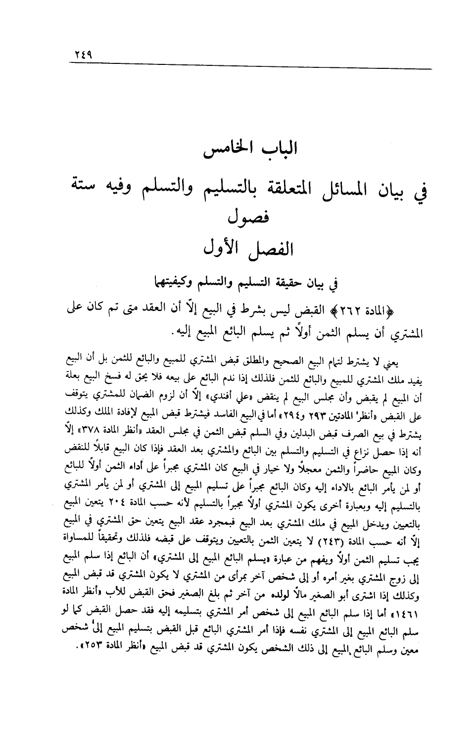 الْفَصْلُ الْأَوَّلُ: فِي بَيَانِ حَقِيقَةِ التَّسْلِيمِ وَالتَّسَلُّمِ وَكَيْفِيَّتِهِمَا (الْمَادَّةُ 262) الْقَبْضُ لَيْسَ بِشَرْطٍ فِي الْبَيْعِ إلَّا أَنَّ الْعَقْدَ مَتَى تَمَّ كَانَ عَلَى الْمُشْتَرِي أَنْ يُسَلِّمَ الثَّمَنَ أَوَّلًا ثُمَّ يُسَلِّمَ الْبَائِعُ الْمَبِيعَ إلَيْهِ. يَعْنِي لَا يُشْتَرَطُ لِتَمَامِ الْبَيْعِ الصَّحِيحِ وَالْمُطْلَقِ قَبْضُ الْمُشْتَرِي لِلْمَبِيعِ وَالْبَائِعَ لِلثَّمَنِ بَلْ إنَّ الْبَيْعَ يُفِيدُ مِلْكَ الْمُشْتَرِي لِلْمَبِيعِ وَالْبَائِعِ لِلثَّمَنِ فَلِذَلِكَ إذَا نَدِمَ الْبَائِعُ عَلَى بَيْعِهِ فَلَا يَحِقُّ لَهُ فَسْخُ الْبَيْعِ بِعِلَّةِ أَنَّ الْمَبِيعَ لَمْ يُقْبَضْ وَأَنَّ مَجْلِسَ الْبَيْعِ لَمْ يَنْقَضِ (عَلِيٌّ أَفَنْدِي) إلَّا أَنَّ لُزُومَ الضَّمَانِ لِلْمُشْتَرِي يَتَوَقَّفُ عَلَى الْقَبْضِ (اُنْظُرْ الْمَادَّتَيْنِ 293 و 294) أَمَّا فِي الْبَيْعِ الْفَاسِدِ فَيُشْتَرَطُ قَبْضُ الْمَبِيعِ لِإِفَادَةِ الْمِلْكِ وَكَذَلِكَ يُشْتَرَطُ فِي بَيْعِ الصَّرْفِ قَبْضُ الْبَدَلَيْنِ وَفِي السَّلَمِ قَبْضُ الثَّمَنِ فِي مَجْلِسِ الْعَقْدِ (اُنْظُرْ الْمَادَّةَ 378) إلَّا أَنَّهُ إذَا حَصَلَ نِزَاعٌ فِي التَّسْلِيمِ وَالتَّسَلُّمِ بَيْنَ الْبَائِعِ وَالْمُشْتَرِي بَعْدَ الْعَقْدِ فَإِذَا كَانَ الْبَيْعُ قَابِلًا لِلنَّقْضِ وَكَانَ الْمَبِيعُ حَاضِرًا وَالثَّمَنُ مُعَجَّلًا وَلَا خِيَارَ فِي الْبَيْعِ كَانَ الْمُشْتَرِي مُجْبَرًا عَلَى أَدَاءِ الثَّمَنِ أَوَّلًا لِلْبَائِعِ أَوْ لِمَنْ يَأْمُرُ الْبَائِعُ بِالْأَدَاءِ إلَيْهِ وَكَانَ الْبَائِعُ مُجْبَرًا عَلَى تَسْلِيمِ الْمَبِيعِ إلَى الْمُشْتَرِي أَوْ لِمَنْ يَأْمُرُ الْمُشْتَرِي بِالتَّسْلِيمِ إلَيْهِ وَبِعِبَارَةٍ أُخْرَى يَكُونُ الْمُشْتَرِي أَوَّلًا مُجْبَرًا بِالتَّسْلِيمِ لِأَنَّهُ حَسَبَ الْمَادَّةِ 204 يَتَعَيَّنُ الْمَبِيعُ بِالتَّعْيِينِ وَيَدْخُلُ الْمَبِيعُ فِي مِلْكِ الْمُشْتَرِي بَعْدَ الْبَيْعِ فَبِمُجَرَّدِ عَقْدِ الْبَيْعِ يَتَعَيَّنُ حَقُّ الْمُشْتَرِي فِي الْمَبِيعِ إلَّا أَنَّهُ حَسَبَ الْمَادَّةِ (243) لَا يَتَعَيَّنُ الثَّمَنُ بِالتَّعْيِينِ وَيَتَوَقَّفُ عَلَى قَبْضِهِ فَلِذَلِكَ وَتَحْقِيقًا لِلْمُسَاوَاةِ يَجِبُ تَسْلِيمُ الثَّمَنِ أَوَّلًا