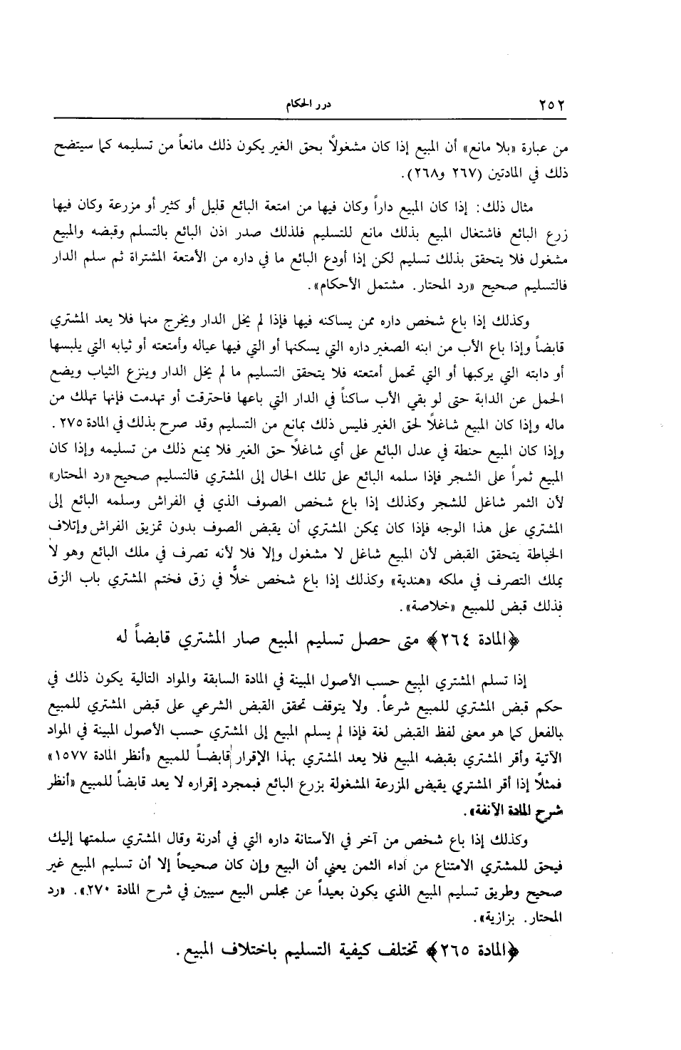 (الْمَادَّةُ 264) مَتَى حَصَلَ تَسْلِيمُ الْمَبِيعِ صَارَ الْمُشْتَرِي قَابِضًا لَهُ إذَا تَسَلَّمَ الْمُشْتَرِي الْمَبِيعَ حَسَبَ الْأُصُولِ الْمُبَيَّنَةِ فِي الْمَادَّةِ السَّابِقَةِ وَالْمَوَادِّ التَّالِيَةِ يَكُونُ ذَلِكَ فِي حُكْمِ قَبْضِ الْمُشْتَرِي لِلْمَبِيعِ شَرْعًا.