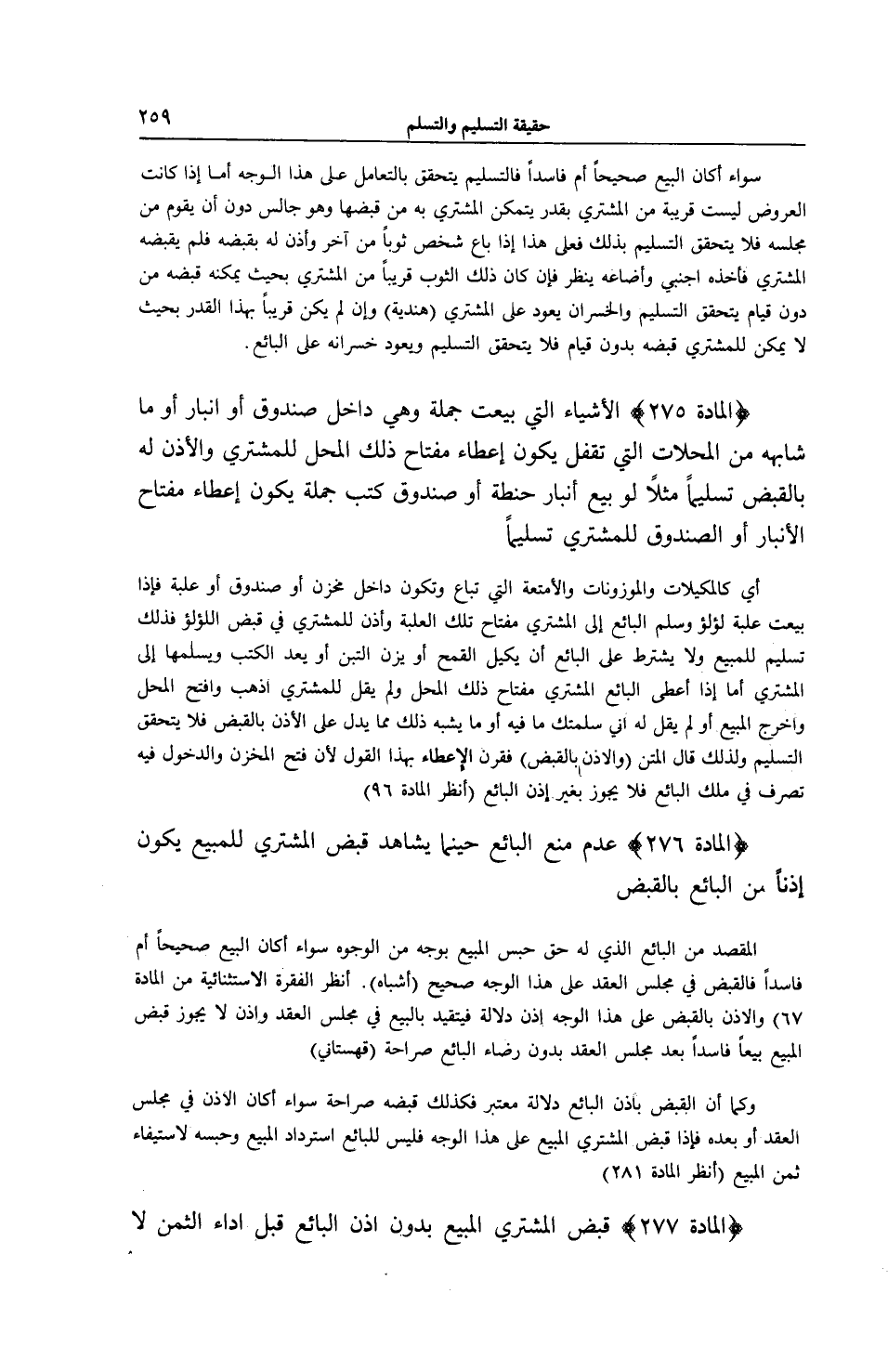 (الْمَادَّةُ 276) عَدَمُ مَنْعِ الْبَائِعِ حِينَمَا يُشَاهِدُ قَبْضَ الْمُشْتَرِي لِلْمَبِيعِ يَكُونُ إذْنًا مِنْ الْبَائِعِ بِالْقَبْضِ الْمَقْصِدُ مِنْ الْبَائِعِ الَّذِي لَهُ حَقُّ حَبْسِ الْمَبِيعِ بِوَجْهٍ مِنْ الْوُجُوهِ سَوَاءٌ أَكَانَ الْبَيْعُ صَحِيحًا أَمْ فَاسِدًا فَالْقَبْضُ فِي مَجْلِسِ الْعَقْدِ عَلَى هَذَا الْوَجْهِ صَحِيحٌ (أَشْبَاهٌ) (اُنْظُرْ الْفِقْرَةَ الِاسْتِثْنَائِيَّة مِنْ الْمَادَّةِ 67) وَالْإِذْنُ بِالْقَبْضِ عَلَى هَذَا الْوَجْهِ إذْنُ دَلَالَةٍ فَيَتَقَيَّدُ بِالْبَيْعِ فِي مَجْلِسِ الْعَقْدِ وَإِذَنْ لَا يَجُوزُ قَبْضُ الْمَبِيعِ بَيْعًا فَاسِدًا بَعْدَ مَجْلِسِ الْعَقْدِ بِدُونِ رِضَاءِ الْبَائِعِ صَرَاحَةً (قُهُسْتَانِيٌّ) وَكَمَا أَنَّ الْقَبْضَ بِإِذْنِ الْبَائِعِ دَلَالَةً مُعْتَبَرٌ فَكَذَلِكَ قَبْضُهُ صَرَاحَةً سَوَاءٌ أَكَانَ الْإِذْنُ فِي مَجْلِسِ الْعَقْدِ أَوْ بَعْدَهُ فَإِذَا قَبَضَ الْمُشْتَرِي الْمَبِيعَ عَلَى هَذَا الْوَجْهِ فَلَيْسَ لِلْبَائِعِ اسْتِرْدَادُ الْمَبِيعِ وَحَبْسُهُ لِاسْتِيفَاءِ ثَمَنِ الْمَبِيعِ (اُنْظُرْ الْمَادَّةَ 281)