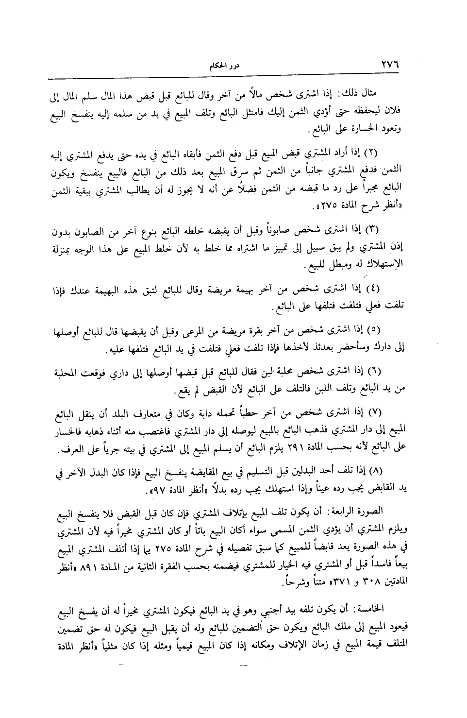 مِثَالُ ذَلِكَ: إذَا اشْتَرَى شَخْصٌ مَالًا مِنْ آخَرَ وَقَالَ لِلْبَائِعِ قَبْلَ قَبْضِ هَذَا الْمَالِ سَلِّمْ الْمَالَ إلَى فُلَانٍ لِيَحْفَظَهُ حَتَّى أُؤَدِّيَ الثَّمَنَ إلَيْك فَامْتَثَلَ الْبَائِعُ وَتَلِفَ الْمَبِيعُ وَتَعُودُ الْخَسَارَةُ عَلَى الْبَائِعِ (2) إذَا أَرَادَ الْمُشْتَرِي قَبْضَ الْمَبِيعِ قَبْلَ دَفْعِ الثَّمَنِ فَأَبْقَاهُ الْبَائِعُ فِي يَدِهِ حَتَّى يَدْفَعَ الْمُشْتَرِي إلَيْهِ الثَّمَنَ فَدَفَعَ الْمُشْتَرِي جَانِبًا مِنْ الثَّمَنِ ثُمَّ سُرِقَ الْمَبِيعُ بَعْدَ ذَلِكَ مِنْ الْبَائِعِ فَالْبَيْعُ يَنْفَسِخُ وَيَكُونُ الْبَائِعُ مُجْبَرًا عَلَى رَدِّ مَا قَبَضَهُ مِنْ الثَّمَنِ فَضْلًا عَنْ أَنَّهُ لَا يَجُوزُ لَهُ أَنْ يُطَالِبَ الْمُشْتَرِي بِبَقِيَّةِ الثَّمَنِ (اُنْظُرْ شَرْحَ الْمَادَّةِ 275) .