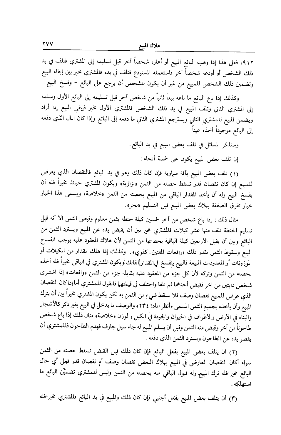(2) أَنْ يَتْلَفَ بَعْضُ الْمَبِيعِ بِفِعْلِ الْبَائِعِ فَإِنْ كَانَ ذَلِكَ قَبْلَ الْقَبْضِ تَسْقُطُ حِصَّتُهُ مِنْ الثَّمَنِ سَوَاءٌ أَكَانَ النُّقْصَانُ الْعَارِضُ فِي الْمَبِيعِ بِهَلَاكِ الْبَعْضِ نُقْصَانَ وَصْفٍ أَمْ نُقْصَانَ قَدَرٍ فَعَلَى أَيِّ حَالٍ الْبَائِعُ مُخَيَّرٌ فَلَهُ تَرْكُ الْمَبِيعِ وَلَهُ قَبُولُ الْبَاقِي مِنْهُ بِحِصَّتِهِ مِنْ الثَّمَنِ وَلَيْسَ لِلْمُشْتَرِي تَضْمِينُ الْبَائِعِ مَا اسْتَهْلَكَهُ.