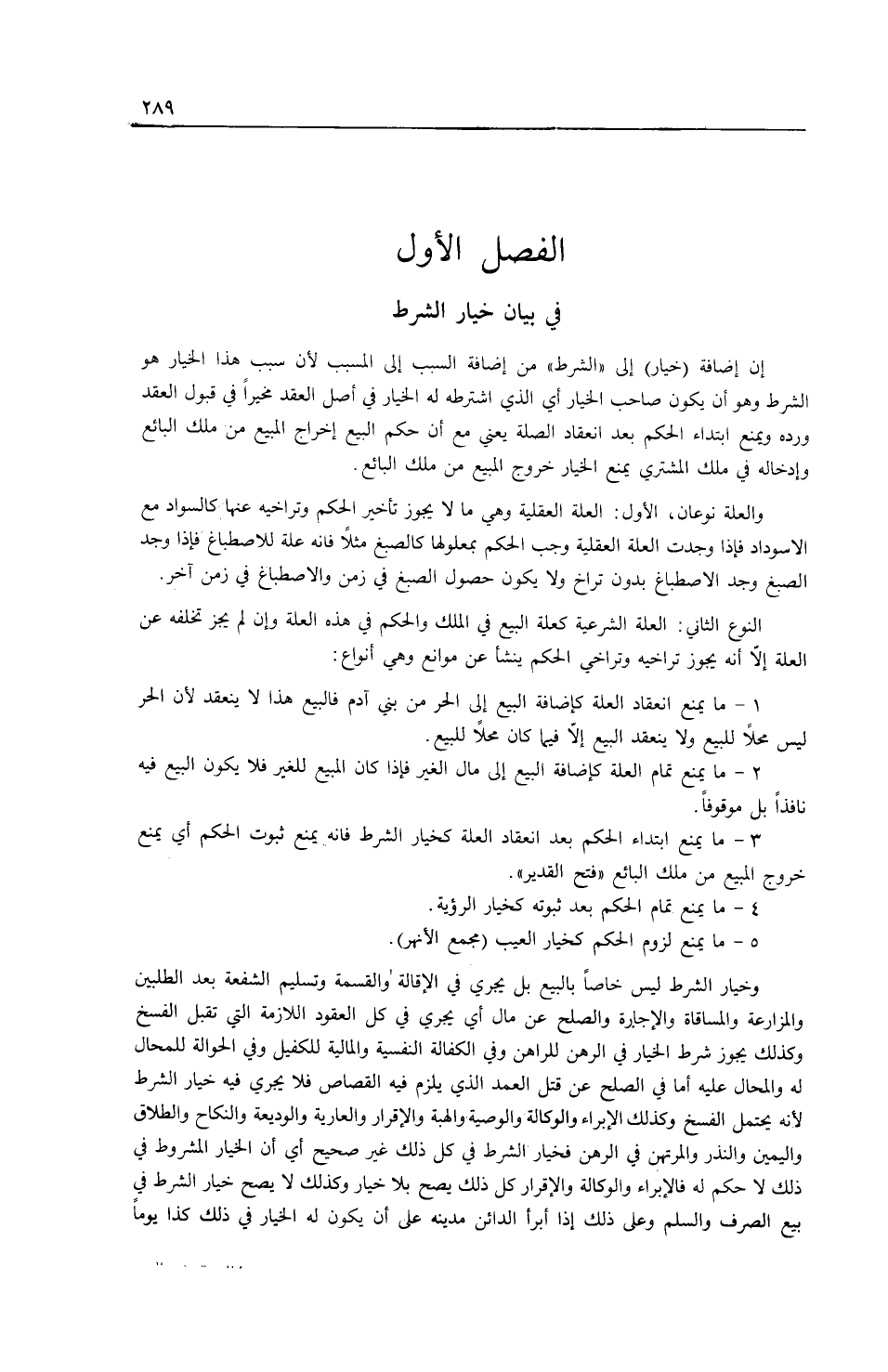 1 - مَا يَمْنَعُ انْعِقَادَ الْعِلَّةِ كَإِضَافَةِ الْبَيْعِ إلَى الْحُرِّ مِنْ بَنِي آدَمَ فَالْبَيْعُ هَذَا لَا يَنْعَقِدُ لِأَنَّ الْحُرَّ لَيْسَ مَحَلًّا لِلْبَيْعِ وَلَا يَنْعَقِدُ الْبَيْعُ إلَّا فِيمَا كَانَ مَحَلًّا لِلْبَيْعِ. 2 - مَا يَمْنَعُ تَمَامَ الْعِلَّةِ كَإِضَافَةِ الْبَيْعِ إلَى مَالِ الْغَيْرِ فَإِذَا كَانَ الْمَبِيعُ لِلْغَيْرِ فَلَا يَكُونُ الْبَيْعُ فِيهِ نَافِذًا بَلْ مَوْقُوفًا. 3 - مَا يَمْنَعُ ابْتِدَاءَ الْحُكْمِ بَعْدَ انْعِقَادِ الْعِلَّةِ كَخِيَارِ الشَّرْطِ فَإِنَّهُ يَمْنَعُ ثُبُوتَ الْحُكْمِ أَيْ يَمْنَعُ خُرُوجَ الْمَبِيعِ مِنْ مِلْكِ الْبَائِعِ (فَتْحُ الْقَدِيرِ) . 4 - مَا يَمْنَعُ تَمَامَ الْحُكْمِ بَعْدَ ثُبُوتِهِ كَخِيَارِ الرُّؤْيَةِ. 5 - مَا يَمْنَعُ لُزُومَ الْحُكْمِ كَخِيَارِ الْعَيْبِ (مَجْمَعُ الْأَنْهُرِ) . وَخِيَارُ الشَّرْطِ لَيْسَ خَاصًّا بِالْبَيْعِ بَلْ يَجْرِي فِي الْإِقَالَةِ وَالْقِسْمَةِ وَتَسْلِيمِ الشُّفْعَةِ بَعْدَ الطَّلَبَيْنِ وَالْمُزَارَعَةِ وَالْمُسَاقَاةِ وَالْإِجَارَةِ وَالصُّلْحِ عَنْ مَالٍ أَيْ يَجْرِي فِي كُلِّ الْعُقُودِ اللَّازِمَةِ الَّتِي تَقْبَلُ الْفَسْخَ وَكَذَلِكَ يَجُوزُ شَرْطُ الْخِيَارِ فِي الرَّهْنِ لِلرَّاهِنِ وَفِي الْكَفَالَةِ النَّفْسِيَّةِ وَالْمَالِيَّةِ لِلْكَفِيلِ وَفِي الْحَوَالَةِ لِلْمُحَالِ لَهُ وَالْمُحَالِ عَلَيْهِ أَمَّا فِي الصُّلْحِ عَنْ قَتْلِ الْعَمْدِ الَّذِي يَلْزَمُ فِيهِ الْقِصَاصُ فَلَا يَجْرِي فِيهِ خِيَارُ الشَّرْطِ لِأَنَّهُ يَحْتَمِلُ الْفَسْخَ وَكَذَلِكَ الْإِبْرَاءُ وَالْوَكَالَةُ وَالْوَصِيَّةُ وَالْهِبَةُ وَالْإِقْرَارُ وَالْعَارِيَّةُ الْوَدِيعَةُ وَالنِّكَاحُ وَالطَّلَاقُ وَالْيَمِينُ وَالنَّذْرُ وَالْمُرْتَهِنُ فِي الرَّهْنِ فَخِيَارُ الشَّرْطِ فِي كُلِّ ذَلِكَ غَيْرُ صَحِيحٍ أَيْ أَنَّ الْخِيَارَ الْمَشْرُوطَ فِي ذَلِكَ لَا حُكْمَ لَهُ فَالْإِبْرَاءُ وَالْوَكَالَةُ وَالْإِقْرَارُ كُلُّ ذَلِكَ يَصِحُّ بِلَا خِيَارٍ وَكَذَلِكَ لَا يَصِحُّ خِيَارُ الشَّرْطِ فِي بَيْعِ الصَّرْفِ وَالسَّلَمِ وَعَلَى ذَلِكَ إذَا أَبْرَأَ الدَّائِنُ مَدِينَهُ عَلَى أَنْ يَكُونَ لَهُ الْخِيَارُ فِي ذَلِكَ كَذَا يَوْمًا