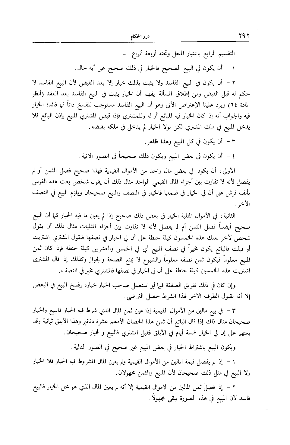 2 - أَنْ يَكُونَ فِي الْبَيْعِ الْفَاسِدِ وَلَا يَثْبُتُ بِذَلِكَ خِيَارٌ إلَّا بَعْدَ الْقَبْضِ لِأَنَّ الْبَيْعَ الْفَاسِدَ لَا حُكْمَ لَهُ قَبْلَ الْقَبْضِ وَمِنْ إطْلَاقِ الْمَسْأَلَةِ يُفْهَمُ أَنَّ الْخِيَارَ يَثْبُتُ فِي الْبَيْعِ الْفَاسِدِ بَعْدَ الْعَقْدِ (اُنْظُرْ الْمَادَّةَ 64) وَيَرِدُ عَلَيْنَا الِاعْتِرَاضُ الْآتِي وَهُوَ أَنَّ الْبَيْعَ الْفَاسِدَ مُسْتَوْجِبٌ لِلْفَسْخِ ذَاتًا فَمَا فَائِدَةُ الْخِيَارِ فِيهِ وَالْجَوَابُ أَنَّهُ إذَا كَانَ الْخِيَارُ فِيهِ لِلْبَائِعِ أَوْ لَهُ وَلِلْمُشْتَرِي فَإِذَا قَبَضَ الْمُشْتَرِي الْمَبِيعَ بِإِذْنِ الْبَائِعِ فَلَا يَدْخُلُ الْمَبِيعُ فِي مِلْكِ الْمُشْتَرِي لَكِنْ لَوْلَا الْخِيَارُ لَمْ يَدْخُلْ فِي مِلْكِهِ بِقَبْضِهِ.
