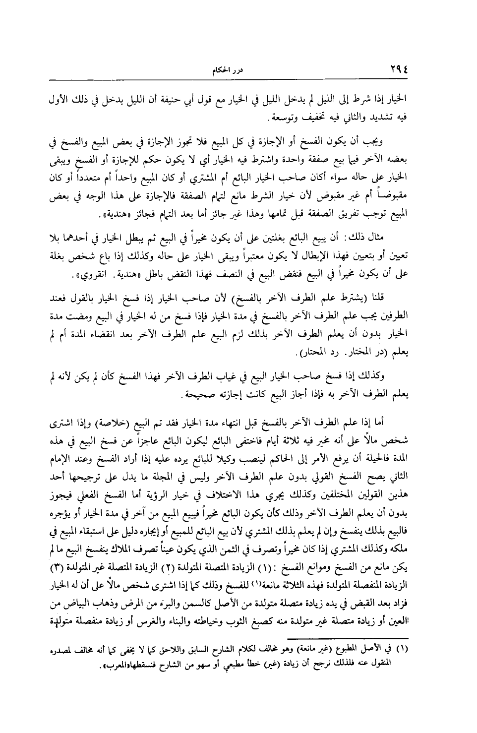 أَمَّا إذَا عَلِمَ الطَّرَفُ الْآخَرُ بِالْفَسْخِ قَبْلَ انْتِهَاءِ مُدَّةِ الْخِيَارِ فَقَدْ تَمَّ الْبَيْعُ (خُلَاصَةٌ) وَإِذَا اشْتَرَى شَخْصٌ مَالًا عَلَى أَنَّهُ مُخَيَّرٌ فِيهِ ثَلَاثَةَ أَيَّامٍ فَاخْتَفَى الْبَائِعُ لِيَكُونَ الْبَائِعُ عَاجِزًا عَنْ فَسْخِ الْبَيْعِ فِي هَذِهِ الْمُدَّةِ فَالْحِيلَةُ أَنْ يُرْفَعَ الْأَمْرُ إلَى الْحَاكِمِ لِيَنْصِبَ وَكِيلًا لِلْبَائِعِ يَرُدُّهُ عَلَيْهِ إذَا أَرَادَ الْفَسْخَ وَعِنْدَ الْإِمَامِ الثَّانِي يَصِحُّ الْفَسْخُ الْقَوْلِيُّ بِدُونِ عِلْمِ الطَّرَفِ الْآخَرِ وَلَيْسَ فِي الْمَجَلَّةِ مَا يَدُلُّ عَلَى تَرْجِيحِهَا أَحَدَ هَذَيْنِ الْقَوْلَيْنِ الْمُخْتَلِفَيْنِ وَكَذَلِكَ يَجْرِي هَذَا الِاخْتِلَافُ فِي خِيَارِ الرُّؤْيَةِ أَمَّا الْفَسْخُ الْفِعْلِيُّ فَيَجُوزُ بِدُونِ أَنْ يَعْلَمَ الطَّرَفُ الْآخَرُ وَذَلِكَ كَأَنْ يَكُونَ الْبَائِعُ مُخَيَّرًا فَيَبِيعَ الْمَبِيعَ مِنْ آخَرَ فِي مُدَّةِ الْخِيَارِ أَوْ يُؤَجِّرَهُ فَالْبَيْعُ بِذَلِكَ يَنْفَسِخُ وَإِنْ لَمْ يَعْلَمْ بِذَلِكَ الْمُشْتَرِي لِأَنَّ بَيْعَ الْبَائِعِ لِلْمَبِيعِ أَوْ إيجَارَهُ دَلِيلٌ عَلَى اسْتِبْقَاءِ الْمَبِيعِ فِي مِلْكِهِ وَكَذَلِكَ الْمُشْتَرِي إذَا كَانَ مُخَيَّرًا وَتَصَرَّفَ فِي الثَّمَنِ الَّذِي يَكُونُ عَيْنًا تَصَرُّفَ الْمُلَّاكِ يَنْفَسِخُ الْبَيْعُ مَا لَمْ يَكُنْ مَانِعٌ مِنْ الْفَسْخِ وَمَوَانِعُ الْفَسْخِ: (1) الزِّيَادَةُ الْمُتَّصِلَةُ الْمُتَوَلِّدَةُ (2) الزِّيَادَةُ الْمُتَّصِلَةُ غَيْرُ الْمُتَوَلِّدَةِ (3) الزِّيَادَةُ الْمُنْفَصِلَةُ الْمُتَوَلِّدَةُ فَهَذِهِ الثَّلَاثَةُ مَانِعَةٌ (1) لِلْفَسْخِ وَذَلِكَ كَمَا إذَا اشْتَرَى شَخْصٌ مَالًا عَلَى أَنَّ لَهُ الْخِيَارَ فَزَادَ بَعْدَ الْقَبْضِ فِي يَدِهِ زِيَادَةً مُتَّصِلَةً مُتَوَلِّدَةً مِنْ الْأَصْلِ كَالسَّمْنِ وَالْبُرْءِ مِنْ الْمَرَضِ وَذَهَابِ الْبَيَاضِ مِنْ الْعَيْنِ أَوْ زِيَادَةً مُتَّصِلَةً غَيْرَ مُتَوَلِّدَةٍ مِنْهُ كَصَبْغِ الثَّوْبِ وَخِيَاطَتِهِ وَالْبِنَاءِ وَالْغَرْسِ، أَوْ زِيَادَةً مُنْفَصِلَةً مُتَوَلِّدَةً