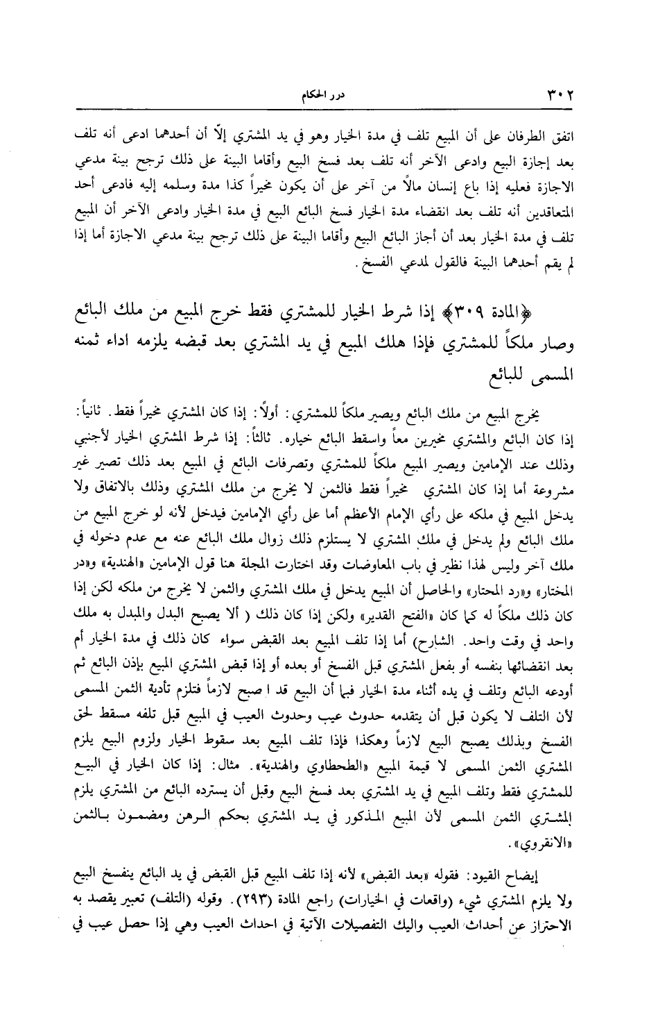 (الْمَادَّةُ 309) إذَا شُرِطَ الْخِيَارُ لِلْمُشْتَرِي فَقَطْ خَرَجَ الْمَبِيعُ مِنْ مِلْكِ الْبَائِعِ وَصَارَ مِلْكًا لِلْمُشْتَرِي فَإِذَا هَلَكَ الْمَبِيعُ فِي يَدِ الْمُشْتَرِي بَعْدَ قَبْضِهِ يَلْزَمُهُ أَدَاءُ ثَمَنِهِ الْمُسَمَّى لِلْبَائِعِ يَخْرُجُ الْمَبِيعُ مِنْ مِلْكِ الْبَائِعِ وَيَصِيرُ مِلْكًا لِلْمُشْتَرِي: