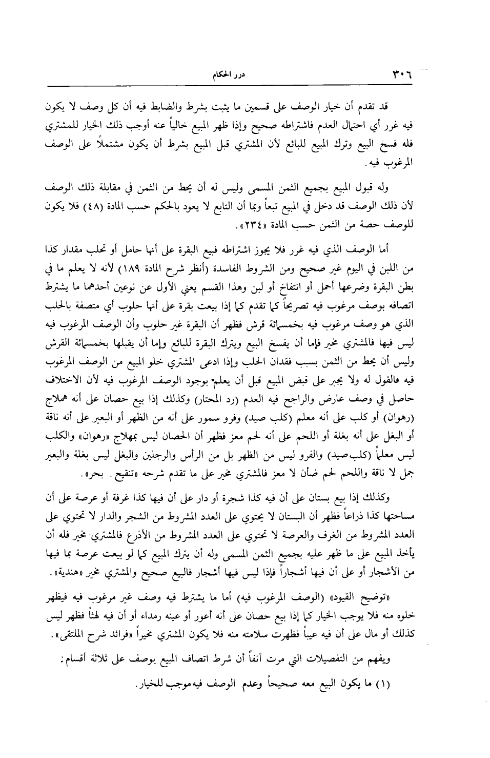 وَيُفْهَمُ مِنْ التَّفْصِيلَاتِ الَّتِي مَرَّتْ آنِفًا أَنَّ شَرْطَ اتِّصَافِ الْمَبِيعِ يُوصَفُ عَلَى ثَلَاثَةِ أَقْسَامٍ: