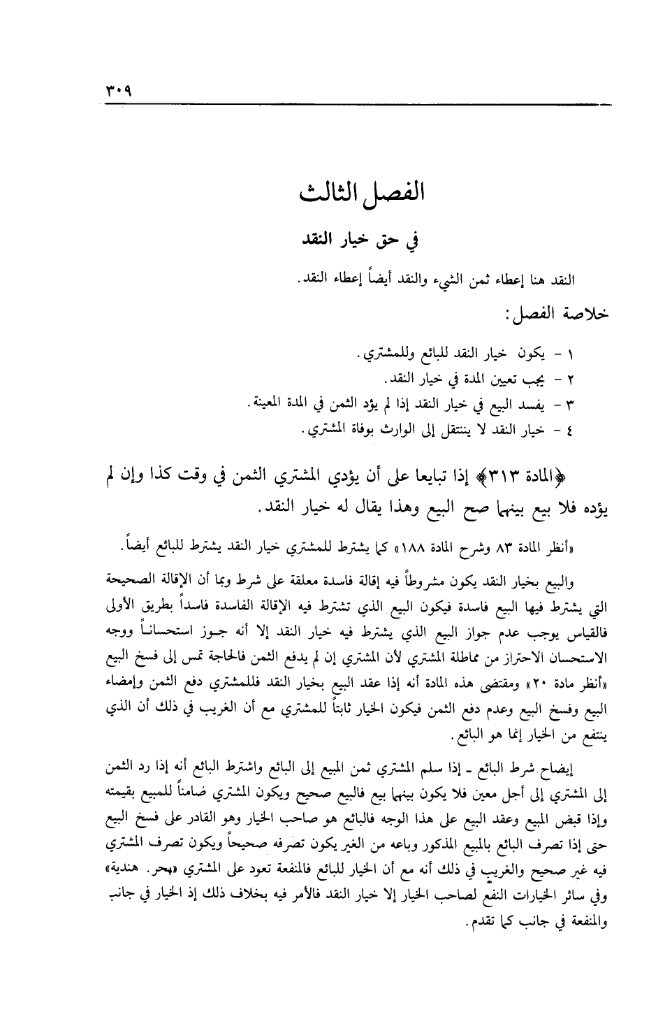 (الْمَادَّةُ 313) إذَا تَبَايَعَا عَلَى أَنْ يُؤَدِّيَ الْمُشْتَرِي الثَّمَنَ فِي وَقْتِ كَذَا وَإِنْ لَمْ يُؤَدِّهِ فَلَا بَيْعَ بَيْنَهُمَا صَحَّ الْبَيْعُ وَهَذَا يُقَالُ لَهُ خِيَارُ النَّقْدِ (اُنْظُرْ الْمَادَّةَ 83 وَشَرْحَ الْمَادَّةِ 188) كَمَا يُشْتَرَطُ لِلْمُشْتَرِي خِيَارُ النَّقْدِ يُشْتَرَطُ لِلْبَائِعِ أَيْضًا. وَالْبَيْعُ بِخِيَارِ النَّقْدِ يَكُونُ مَشْرُوطًا فِيهِ إقَالَةٌ فَاسِدَةٌ مُعَلَّقَةٌ عَلَى شَرْطٍ وَبِمَا أَنَّ الْإِقَالَةَ الصَّحِيحَةَ الَّتِي يُشْتَرَطُ فِيهَا الْبَيْعُ فَاسِدَةٌ فَيَكُونُ الْبَيْعُ الَّذِي تُشْتَرَطُ فِيهِ الْإِقَالَةُ الْفَاسِدَةُ فَاسِدًا بِطَرِيقِ الْأَوْلَى فَالْقِيَاسُ يُوجِبُ عَدَمَ جَوَازِ الْبَيْعِ الَّذِي يُشْتَرَطُ فِيهِ خِيَارُ النَّقْدِ إلَّا أَنَّهُ جُوِّزَ اسْتِحْسَانًا وَوَجْهُ الِاسْتِحْسَانِ الِاحْتِرَازُ مِنْ مُمَاطَلَةِ الْمُشْتَرِي لِأَنَّ الْمُشْتَرِي إنْ لَمْ يَدْفَعْ الثَّمَنَ فَالْحَاجَةُ تَمَسُّ إلَى فَسْخِ الْبَيْعِ (اُنْظُرْ مَادَّةَ 20) وَمُقْتَضَى هَذِهِ الْمَادَّةِ أَنَّهُ إذَا عُقِدَ الْبَيْعُ بِخِيَارِ النَّقْدِ فَلِلْمُشْتَرِي دَفْعُ الثَّمَنِ وَإِمْضَاءُ الْبَيْعِ وَفَسْخُ الْبَيْعِ وَعَدَمُ دَفْعِ الثَّمَنِ فَيَكُونُ الْخِيَارُ ثَابِتًا لِلْمُشْتَرِي مَعَ أَنَّ الْغَرِيبَ فِي ذَلِكَ أَنَّ الَّذِي يَنْتَفِعُ مِنْ الْخِيَارِ إنَّمَا هُوَ الْبَائِعُ.
