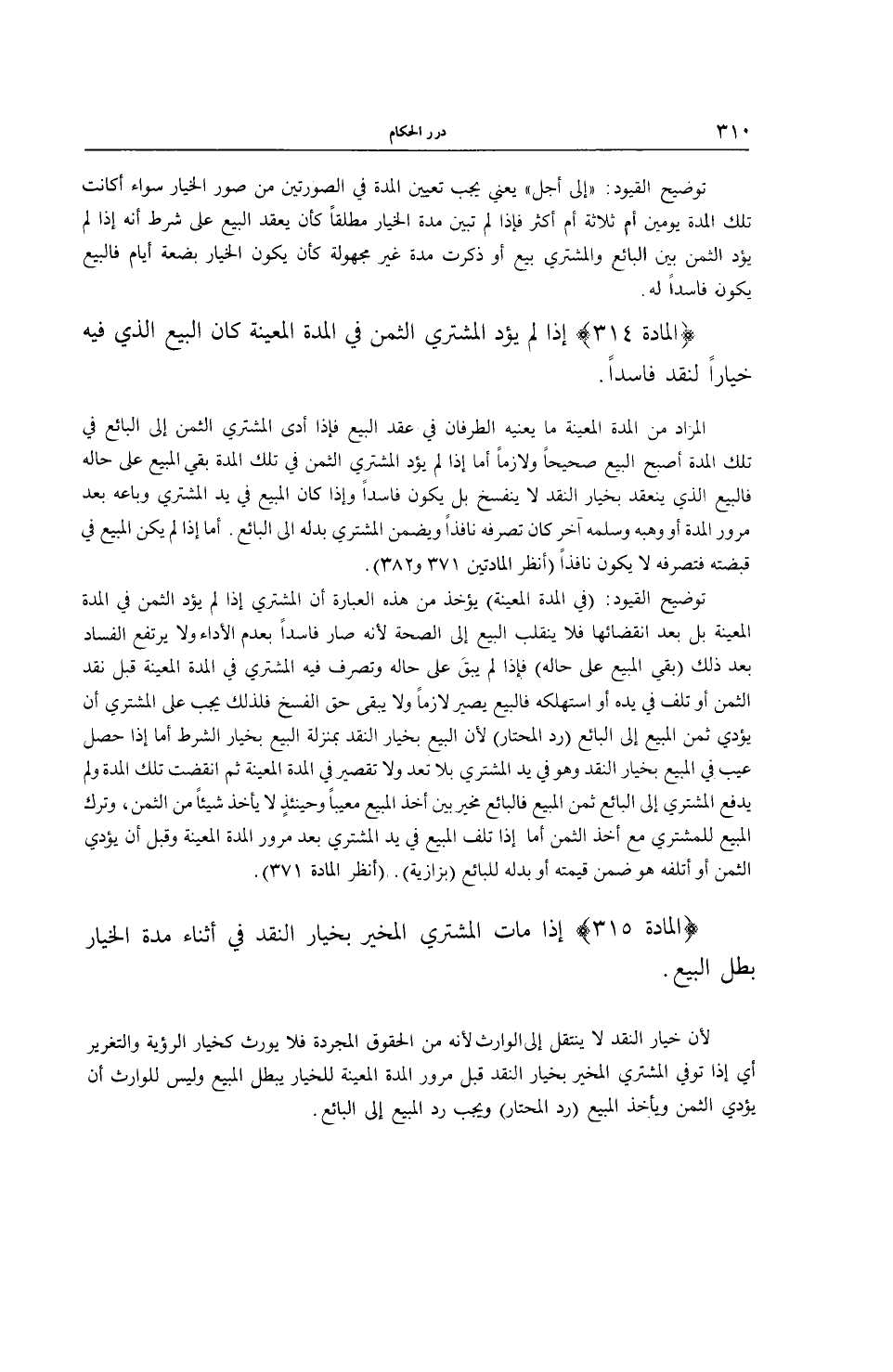 (الْمَادَّةُ 315) إذَا مَاتَ الْمُشْتَرِي الْمُخَيَّرُ بِخِيَارِ النَّقْدِ فِي أَثْنَاءِ مُدَّةِ الْخِيَارِ بَطَلَ الْبَيْعُ. لِأَنَّ خِيَارَ النَّقْدِ لَا يَنْتَقِلُ إلَى الْوَارِثِ لِأَنَّهُ مِنْ الْحُقُوقِ الْمُجَرَّدَةِ فَلَا يُورَثُ كَخِيَارِ الرُّؤْيَةِ وَالتَّغْرِيرِ أَيْ إذَا تُوُفِّيَ الْمُشْتَرِي الْمُخَيَّرُ بِخِيَارِ النَّقْدِ قَبْلَ مُرُورِ الْمُدَّةِ الْمُعَيَّنَةِ لِلْخِيَارِ يَبْطُلُ الْمَبِيعُ وَلَيْسَ لِلْوَارِثِ أَنْ يُؤَدِّيَ الثَّمَنَ وَيَأْخُذَ الْمَبِيعَ (رَدُّ الْمُحْتَارِ) وَيَجِبُ رَدُّ الْمَبِيعِ إلَى الْبَائِعِ.