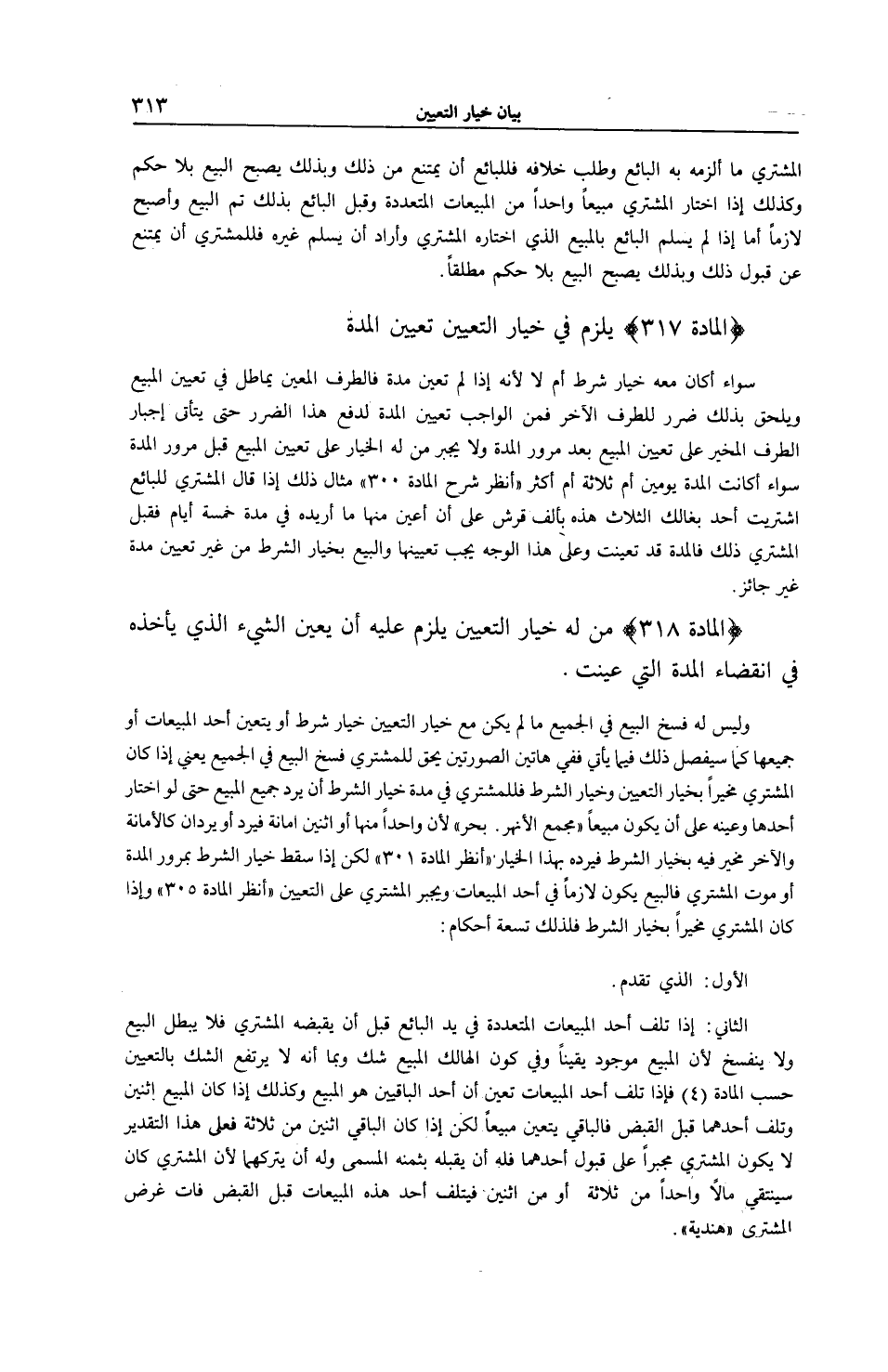 [ (الْمَادَّةُ 318) مَنْ لَهُ خِيَارُ التَّعْيِينِ يَلْزَمُ عَلَيْهِ أَنْ يُعَيِّنَ الشَّيْءَ الَّذِي يَأْخُذُهُ فِي انْقِضَاءِ الْمُدَّةِ]