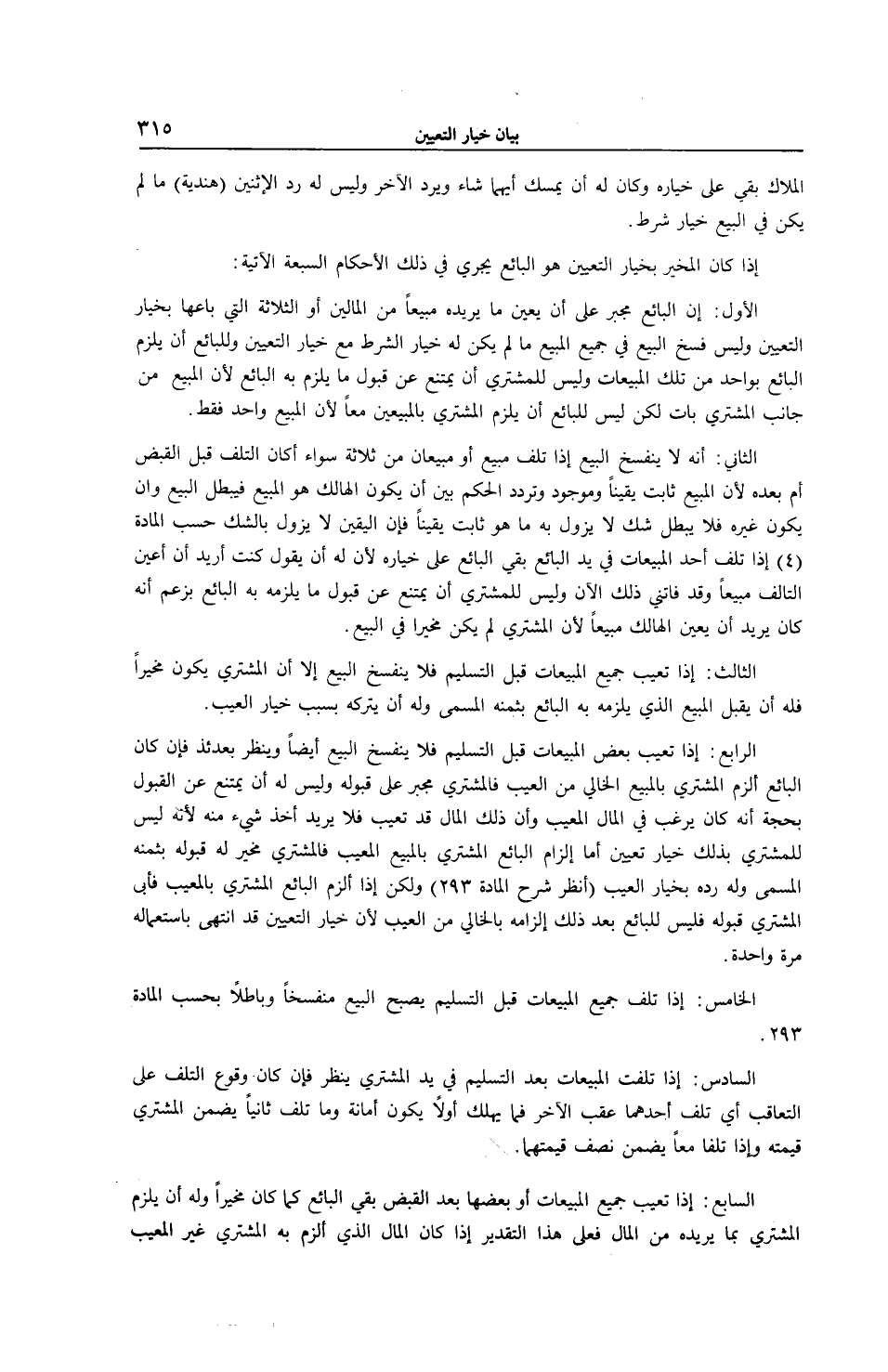 الْأَوَّلُ: إنَّ الْبَائِعَ مُجْبَرٌ عَلَى أَنْ يُعَيِّنَ مَا يُرِيدُهُ مَبِيعًا مِنْ الْمَالَيْنِ أَوْ الثَّلَاثَةِ الَّتِي بَاعَهَا بِخِيَارِ التَّعْيِينِ وَلَيْسَ فَسْخُ الْبَيْعِ فِي جَمِيعِ الْمَبِيعِ مَا لَمْ يَكُنْ لَهُ خِيَارُ الشَّرْطِ مَعَ خِيَارِ التَّعْيِينِ وَلِلْبَائِعِ أَنْ يُلْزِمَ الْبَائِعَ بِوَاحِدٍ مِنْ تِلْكَ الْمَبِيعَاتِ وَلَيْسَ لِلْمُشْتَرِي أَنْ يَمْتَنِعَ عَنْ قَبُولِ مَا يُلْزِمُ بِهِ الْبَائِعَ لِأَنَّ الْمَبِيعَ مِنْ جَانِبِ الْمُشْتَرِي بَاتٌّ لَكِنْ لَيْسَ لِلْبَائِعِ أَنْ يُلْزِمَ الْمُشْتَرِيَ بِالْمَبِيعِينَ مَعًا لِأَنَّ الْمَبِيعَ وَاحِدٌ فَقَطْ.