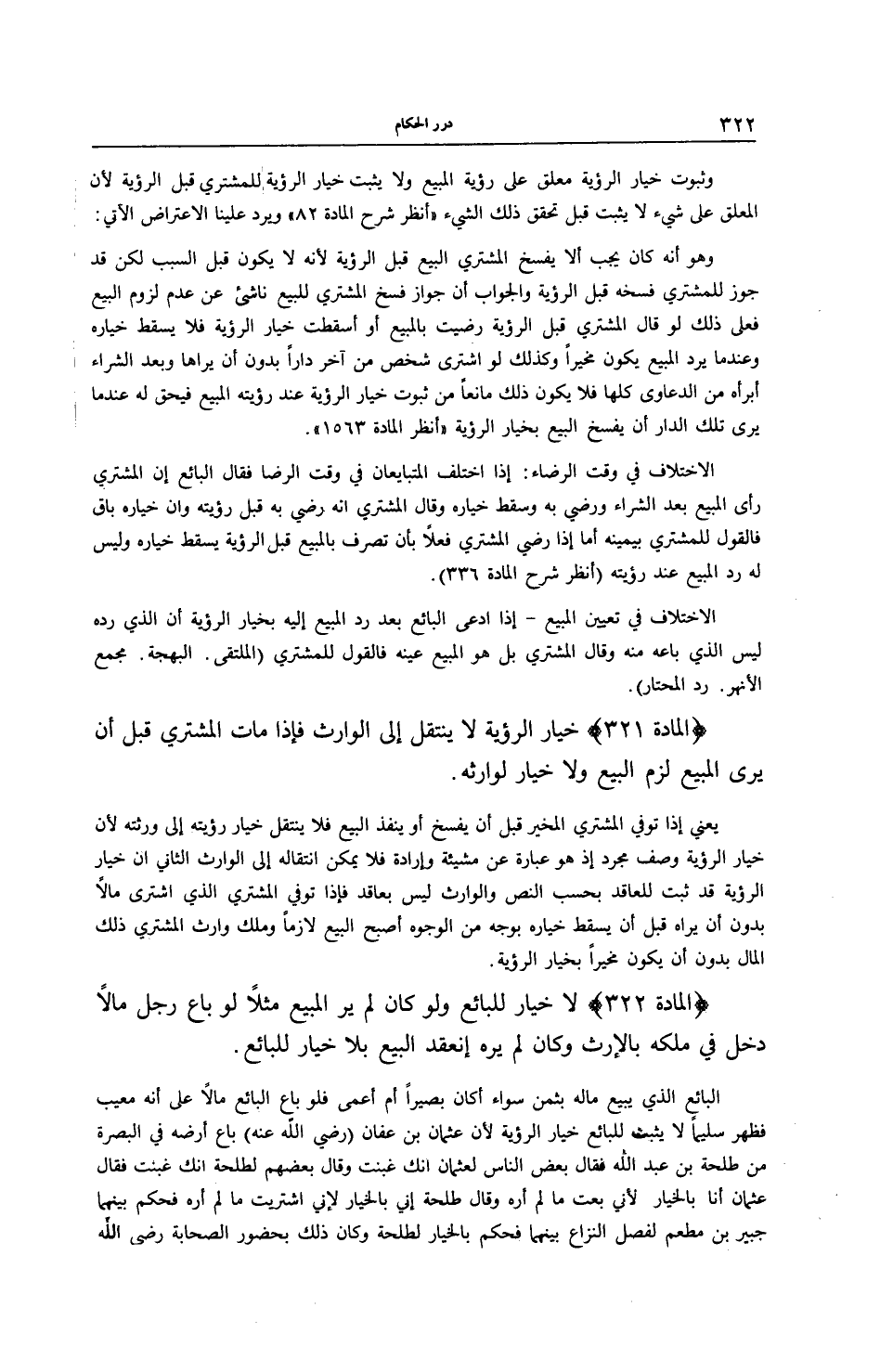 (الْمَادَّةُ 321) خِيَارُ الرُّؤْيَةِ لَا يَنْتَقِلُ إلَى الْوَارِثِ فَإِذَا مَاتَ الْمُشْتَرِي قَبْلَ أَنْ يَرَى الْمَبِيعَ لَزِمَ الْبَيْعُ وَلَا خِيَارَ لِوَارِثِهِ. يَعْنِي إذَا تُوُفِّيَ الْمُشْتَرِي الْمُخَيَّرُ قَبْلَ أَنْ يَفْسَخَ أَوْ يُنْفِذَ الْبَيْعَ فَلَا يَنْتَقِلُ خِيَارُ رُؤْيَتِهِ إلَى وَرَثَتِهِ لِأَنَّ خِيَارَ الرُّؤْيَةِ وَصْفٌ مُجَرَّدٌ إذْ هُوَ عِبَارَةٌ عَنْ مَشِيئَةٍ وَإِرَادَةٍ فَلَا يُمْكِنُ انْتِقَالُهُ إلَى الْوَارِثِ الثَّانِي إنَّ خِيَارَ الرُّؤْيَةِ قَدْ ثَبَتَ لِلْعَاقِدِ بِحَسَبِ النَّصِّ وَالْوَارِثُ لَيْسَ بِعَاقِدٍ فَإِذَا تُوُفِّيَ الْمُشْتَرِي الَّذِي اشْتَرَى مَالًا بِدُونِ أَنْ يَرَاهُ قَبْلَ أَنْ يَسْقُطَ خِيَارُهُ بِوَجْهٍ مِنْ الْوُجُوهِ أَصْبَحَ الْبَيْعُ لَازِمًا وَمَلَكَ وَارِثُ الْمُشْتَرِي ذَلِكَ الْمَالَ بِدُونِ أَنْ يَكُونَ مُخَيَّرًا بِخِيَارِ الرُّؤْيَةِ.