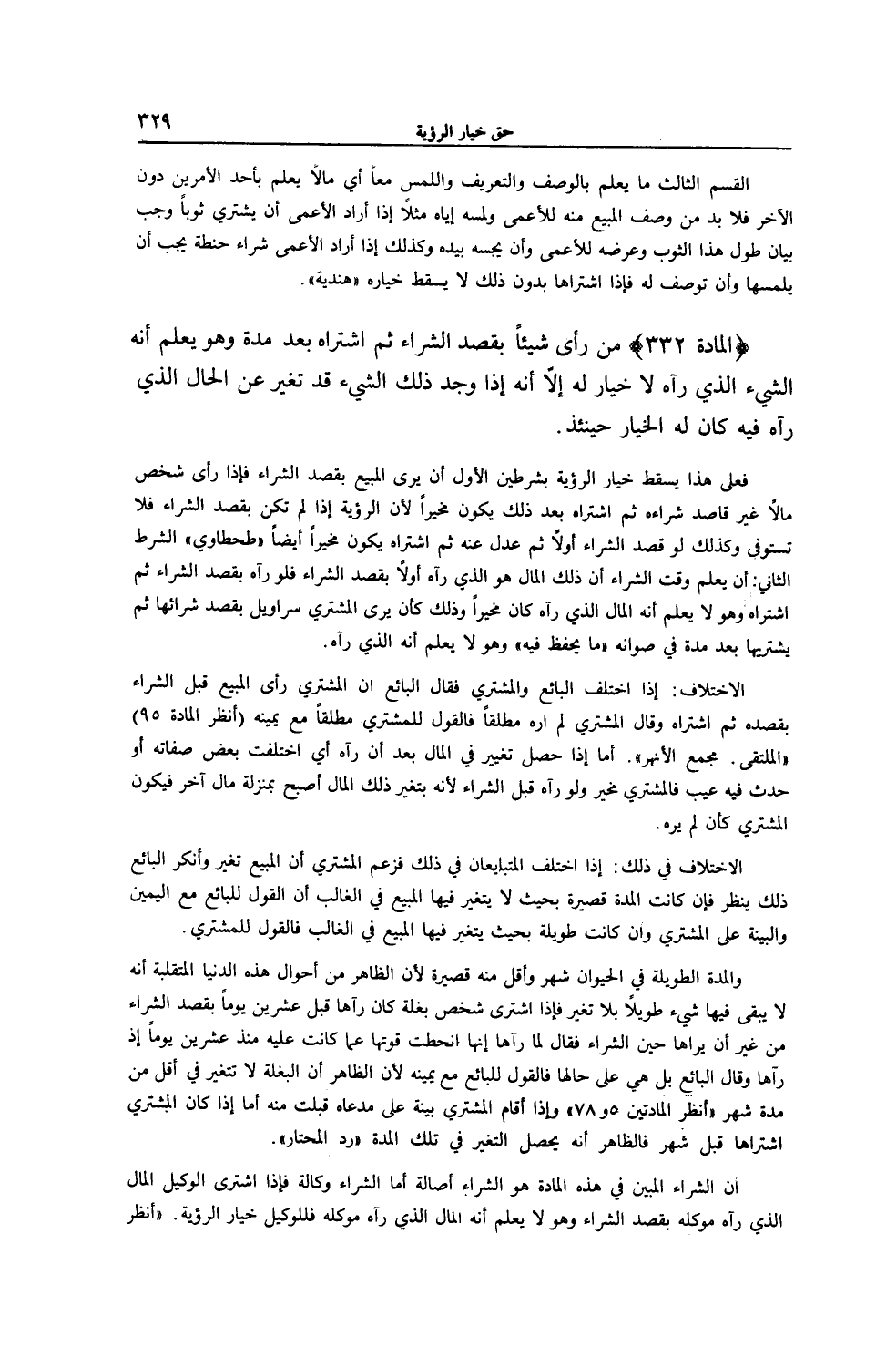 (الْمَادَّةُ 332) مَنْ رَأَى شَيْئًا بِقَصْدِ الشِّرَاءِ ثُمَّ اشْتَرَاهُ بَعْدَ مُدَّةٍ وَهُوَ يَعْلَمُ أَنَّهُ الشَّيْءُ الَّذِي رَآهُ لَا خِيَارَ لَهُ إلَّا أَنَّهُ إذَا وَجَدَ ذَلِكَ الشَّيْءَ قَدْ تَغَيَّرَ عَنْ الْحَالِ الَّذِي رَآهُ فِيهِ كَانَ لَهُ الْخِيَارُ حِينَئِذٍ. فَعَلَى هَذَا يَسْقُطُ خِيَارُ الرُّؤْيَةِ بِشَرْطَيْنِ: