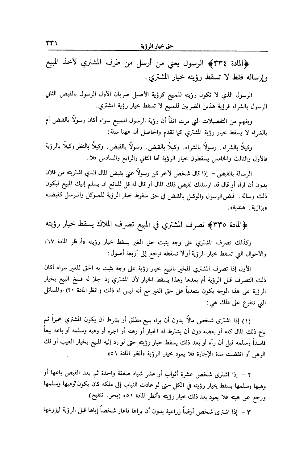 [ (الْمَادَّةُ 334) الرَّسُولُ يَعْنِي مَنْ أُرْسِلَ مِنْ طَرَفِ الْمُشْتَرِي لِأَخْذِ الْمَبِيعِ وَإِرْسَالُهُ فَقَطْ]