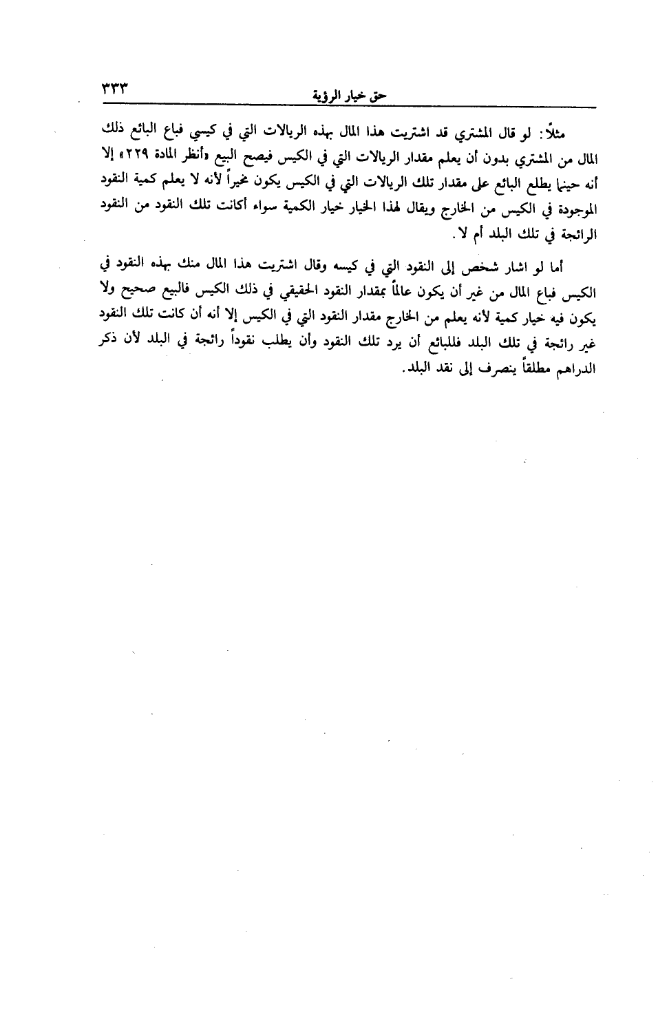 مَثَلًا: لَوْ قَالَ الْمُشْتَرِي قَدْ اشْتَرَيْت هَذَا الْمَالَ بِهَذِهِ الرِّيَالَاتِ الَّتِي فِي كِيسِي فَبَاعَ الْبَائِعُ ذَلِكَ الْمَالَ مِنْ الْمُشْتَرِي بِدُونِ أَنْ يَعْلَمَ مِقْدَارَ الرِّيَالَاتِ الَّتِي فِي الْكِيسِ فَيَصِحُّ الْبَيْعُ " اُنْظُرْ الْمَادَّةَ 229 " إلَّا أَنَّهُ حِينَمَا يَطَّلِعُ الْبَائِعُ عَلَى مِقْدَارِ تِلْكَ الرِّيَالَاتِ الَّتِي فِي الْكِيسِ يَكُونُ مُخَيَّرًا لِأَنَّهُ لَا يَعْلَمُ كَمِّيَّةَ النُّقُودِ الْمَوْجُودَةِ فِي الْكِيسِ مِنْ الْخَارِجِ وَيُقَالُ لِهَذَا الْخِيَارِ خِيَارَ الْكَمِّيَّةِ سَوَاءٌ أَكَانَتْ تِلْكَ النُّقُودُ مِنْ النُّقُودِ الرَّائِجَةِ فِي تِلْكَ الْبَلَدِ أَمْ لَا.