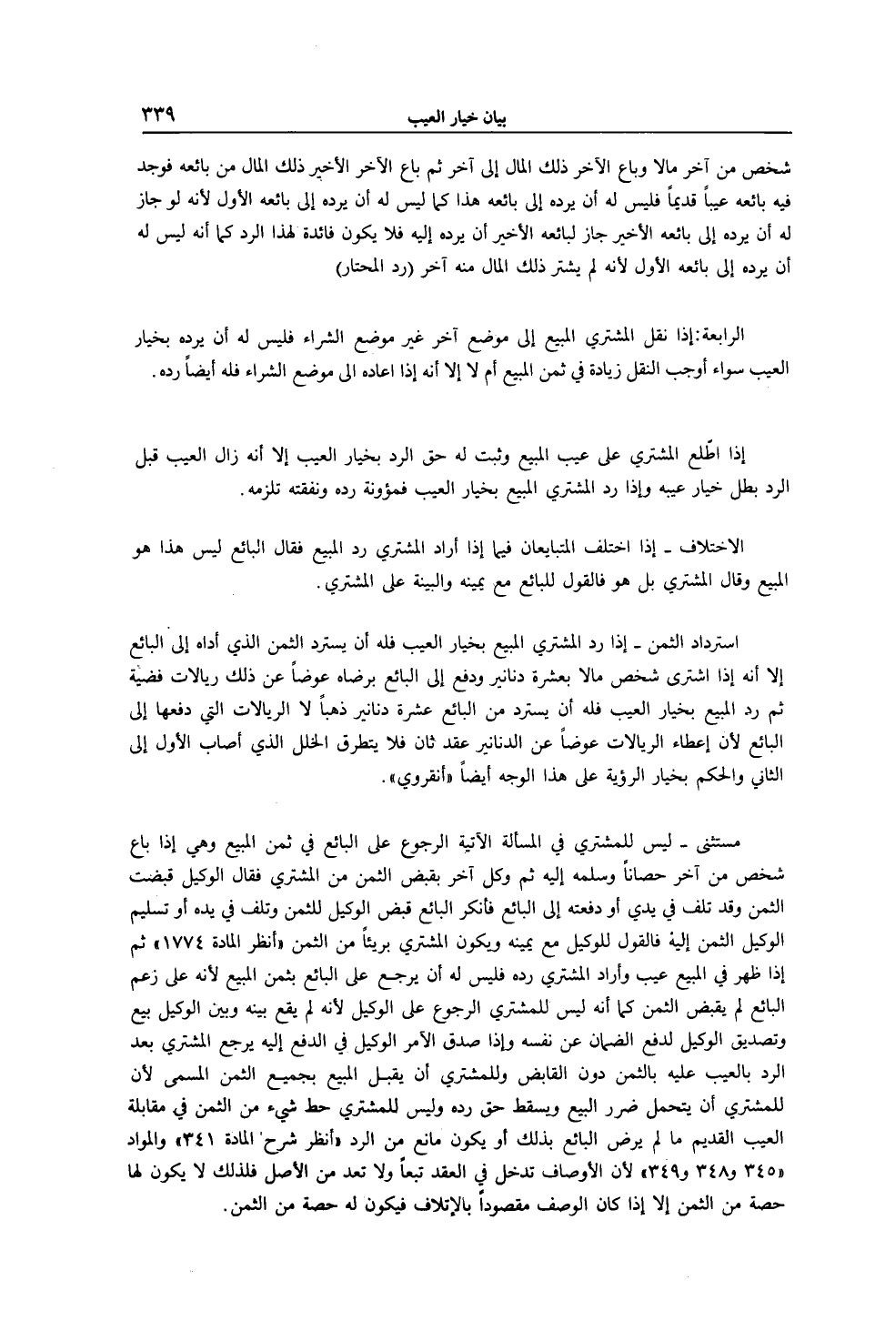 مُسْتَثْنًى - لَيْسَ لِلْمُشْتَرِي فِي الْمَسْأَلَةِ الْآتِيَةِ الرُّجُوعُ عَلَى الْبَائِعِ فِي ثَمَنِ الْمَبِيعِ وَهِيَ إذَا بَاعَ شَخْصٌ مِنْ آخَرَ حِصَانًا وَسَلَّمَهُ إلَيْهِ ثُمَّ وَكَّلَ آخَرَ بِقَبْضِ الثَّمَنِ مِنْ الْمُشْتَرِي فَقَالَ الْوَكِيلُ قَبَضْت الثَّمَنَ وَقَدْ تَلِفَ فِي يَدِي أَوْ دَفَعْته إلَى الْبَائِعِ فَأَنْكَرَ الْبَائِعُ قَبْضَ الْوَكِيلِ لِلثَّمَنِ وَالتَّلَفَ فِي يَدِهِ أَوْ تَسْلِيمَ الْوَكِيلِ الثَّمَنَ إلَيْهِ فَالْقَوْلُ لِلْوَكِيلِ مَعَ يَمِينِهِ وَيَكُونُ الْمُشْتَرِي بَرِيئًا مِنْ الثَّمَنِ " اُنْظُرْ الْمَادَّةَ 1774 " ثُمَّ إذَا ظَهَرَ فِي الْمَبِيعِ عَيْبٌ وَأَرَادَ الْمُشْتَرِي رَدَّهُ فَلَيْسَ لَهُ أَنْ يَرْجِعَ عَلَى الْبَائِعِ بِثَمَنِ الْمَبِيعِ لِأَنَّهُ عَلَى زَعْمِ الْبَائِعِ لَمْ يَقْبِضْ الثَّمَنَ كَمَا أَنَّهُ لَيْسَ لِلْمُشْتَرِي الرُّجُوعُ عَلَى الْوَكِيلِ لِأَنَّهُ لَمْ يَقَعْ بَيْنَهُ وَبَيْنَ الْوَكِيلِ بَيْعٌ وَتَصْدِيقُ الْوَكِيلِ لِدَفْعِ الضَّمَانِ عَنْ نَفْسِهِ وَإِذَا صَدَّقَ الْآمِرُ الْوَكِيلَ فِي الدَّفْعِ إلَيْهِ يَرْجِعُ الْمُشْتَرِي بَعْدَ الرَّدِّ بِالْعَيْبِ عَلَيْهِ بِالثَّمَنِ دُونَ الْقَابِضِ وَلِلْمُشْتَرِي أَنْ يَقْبَلَ الْمَبِيعَ بِجَمِيعِ الثَّمَنِ الْمُسَمَّى لِأَنَّ لِلْمُشْتَرِي أَنْ يَتَحَمَّلَ ضَرَرَ الْبَيْعِ وَيَسْقُطُ حَقُّ رَدِّهِ وَلَيْسَ لِلْمُشْتَرِي حَطُّ شَيْءٍ مِنْ الثَّمَنِ فِي مُقَابَلَةِ الْعَيْبِ الْقَدِيمِ مَا لَمْ يَرْضَ الْبَائِعُ بِذَلِكَ أَوْ يَكُونُ مَانِعٌ مِنْ الرَّدِّ " اُنْظُرْ شَرْحَ الْمَادَّةِ 341 " وَالْمَوَادَّ " 345 و 348 و 349 " لِأَنَّ الْأَوْصَافَ تَدْخُلُ فِي الْعَقْدِ تَبَعًا وَلَا تُعَدُّ مِنْ الْأَصْلِ فَلِذَلِكَ لَا يَكُونُ لَهَا حِصَّةٌ مِنْ الثَّمَنِ إلَّا إذَا كَانَ الْوَصْفُ مَقْصُودًا بِالْإِتْلَافِ فَيَكُونُ لَهُ حِصَّةٌ مِنْ الثَّمَنِ.